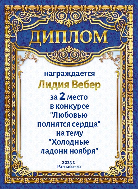 За 2 место в конкурсе Любовью полнятся сердца на тему "Холодные ладони ноября". Поздравляем!