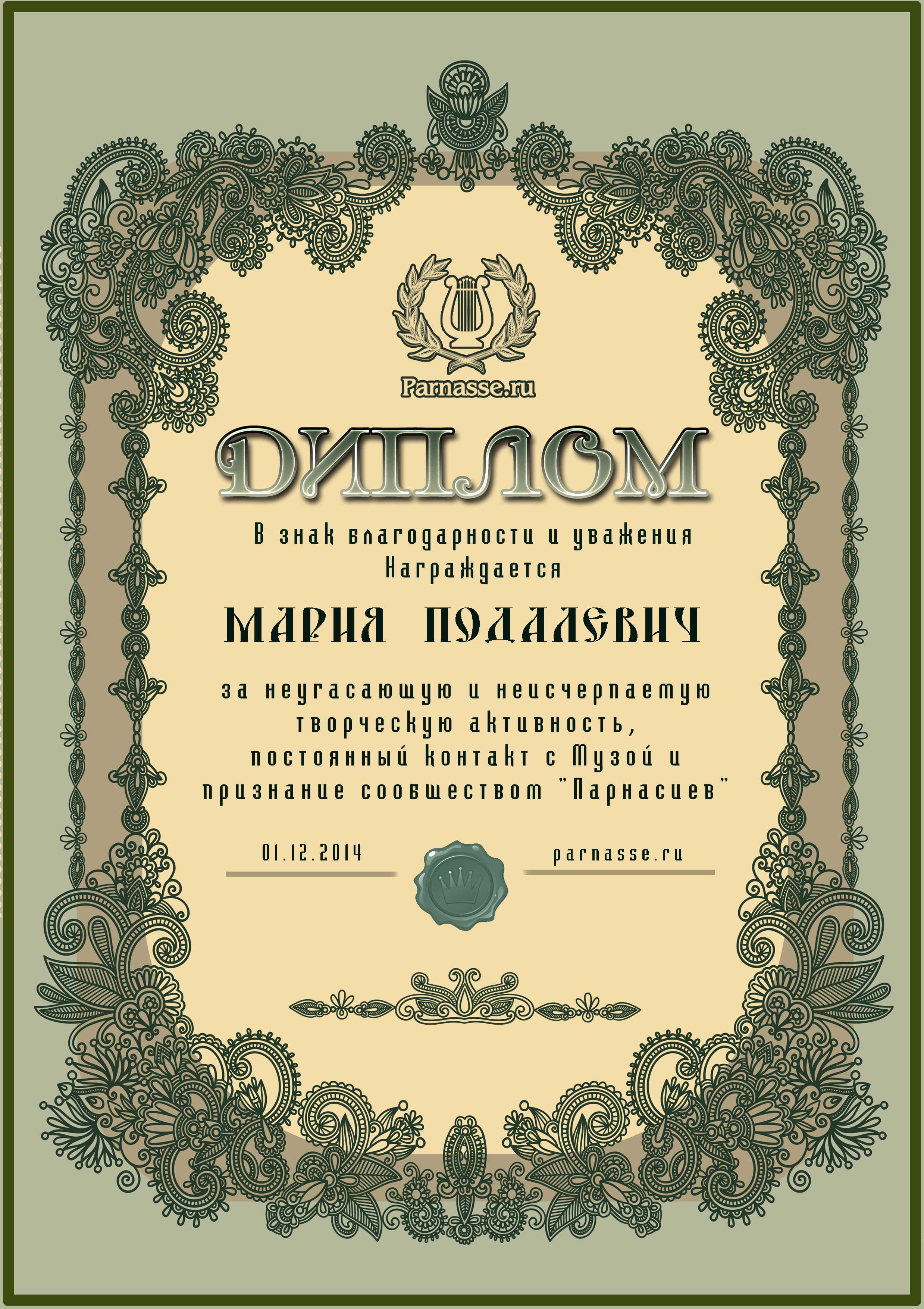 За неугасающую и неисчерпаемую творческую активность, постоянный контакт с Музой и признание сообществом "Парнасцев".От всей души желаем Вам, Мария, здоровья, любви, успехов, благополучия, удачи и творческого вдохновения!