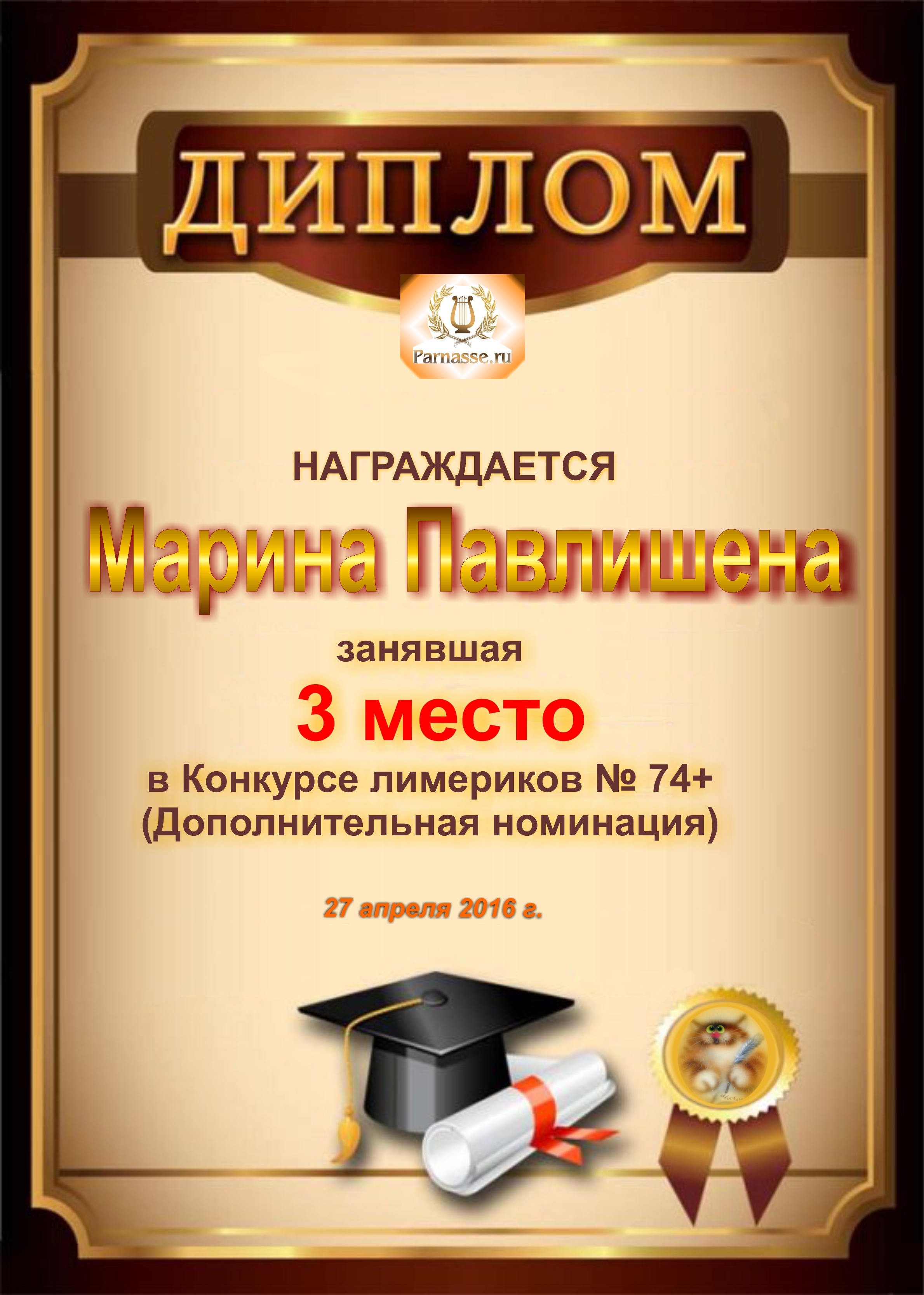 Похвальная грамота за 4 место и активное участие в конкурсе лимериков № 69+ (25.05.2015 г.)