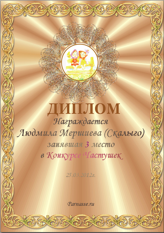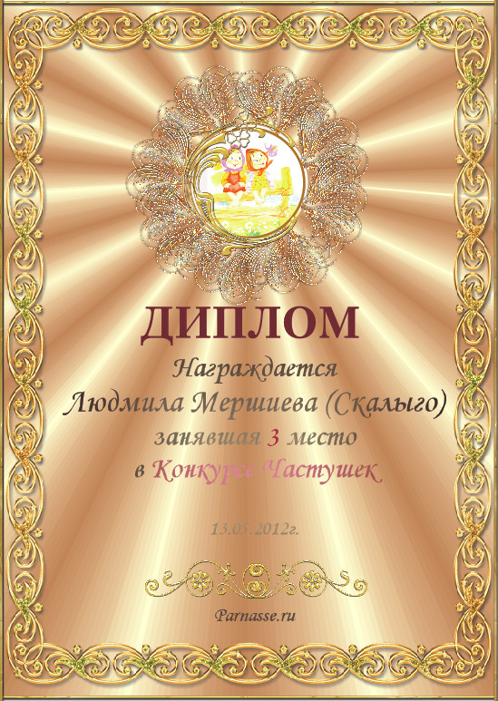 ![]() Медаль за ТРЕТЬЕ место в 4-ом конкурсе Частушек!
