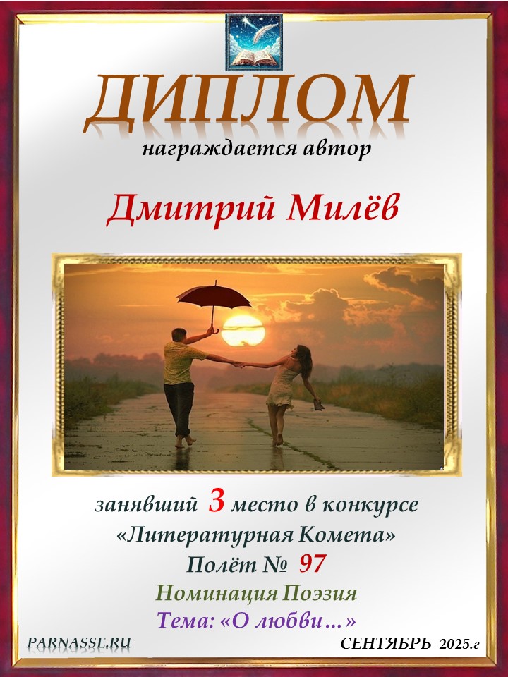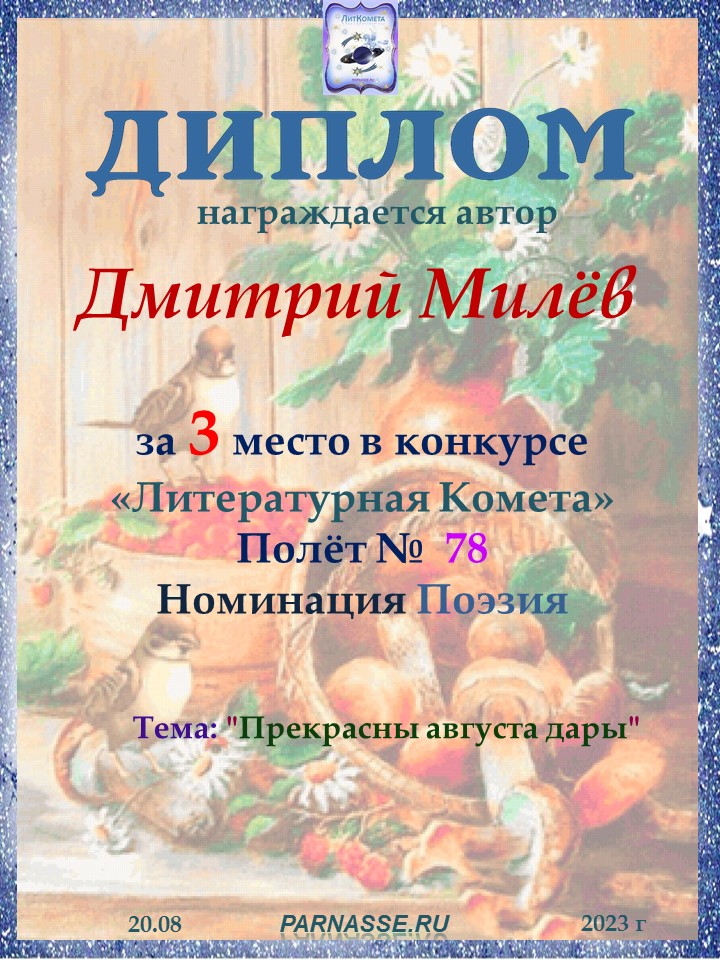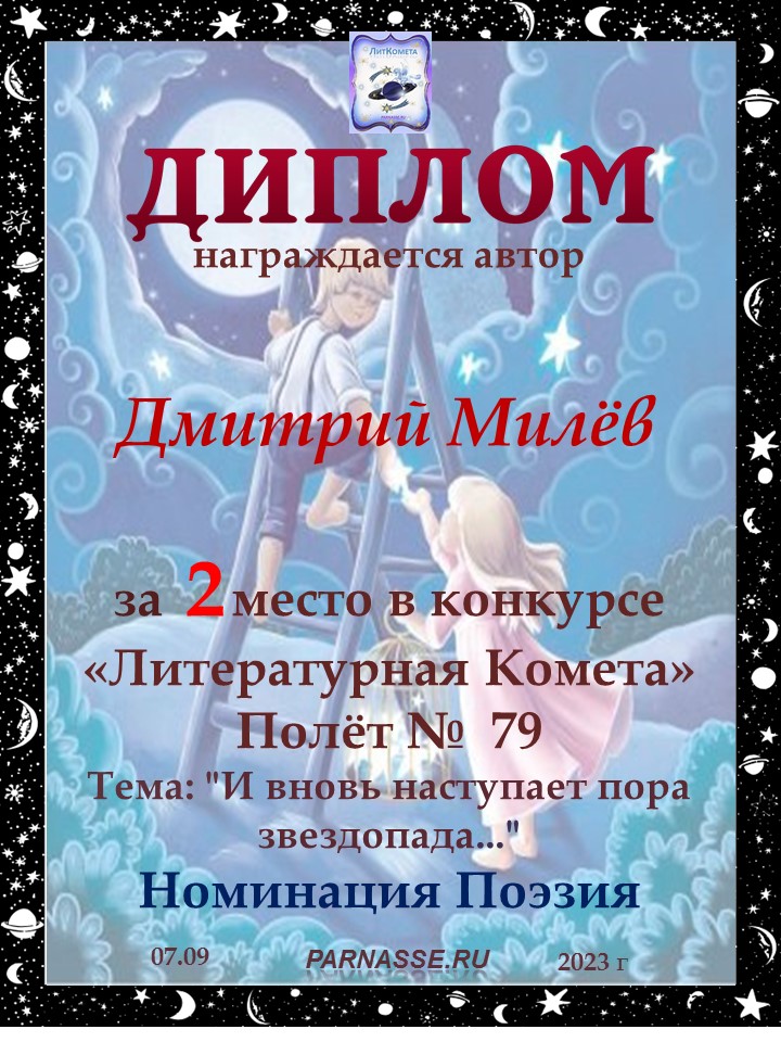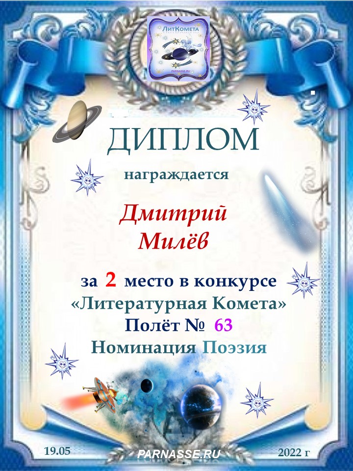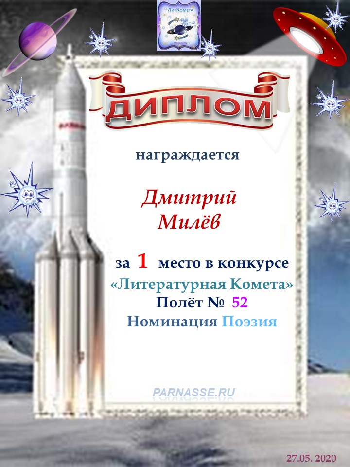 Поздравляю с занятым 1 местом в конкурсе «Литературная Комета – Полёт № 52» - Номинация Поэзия!