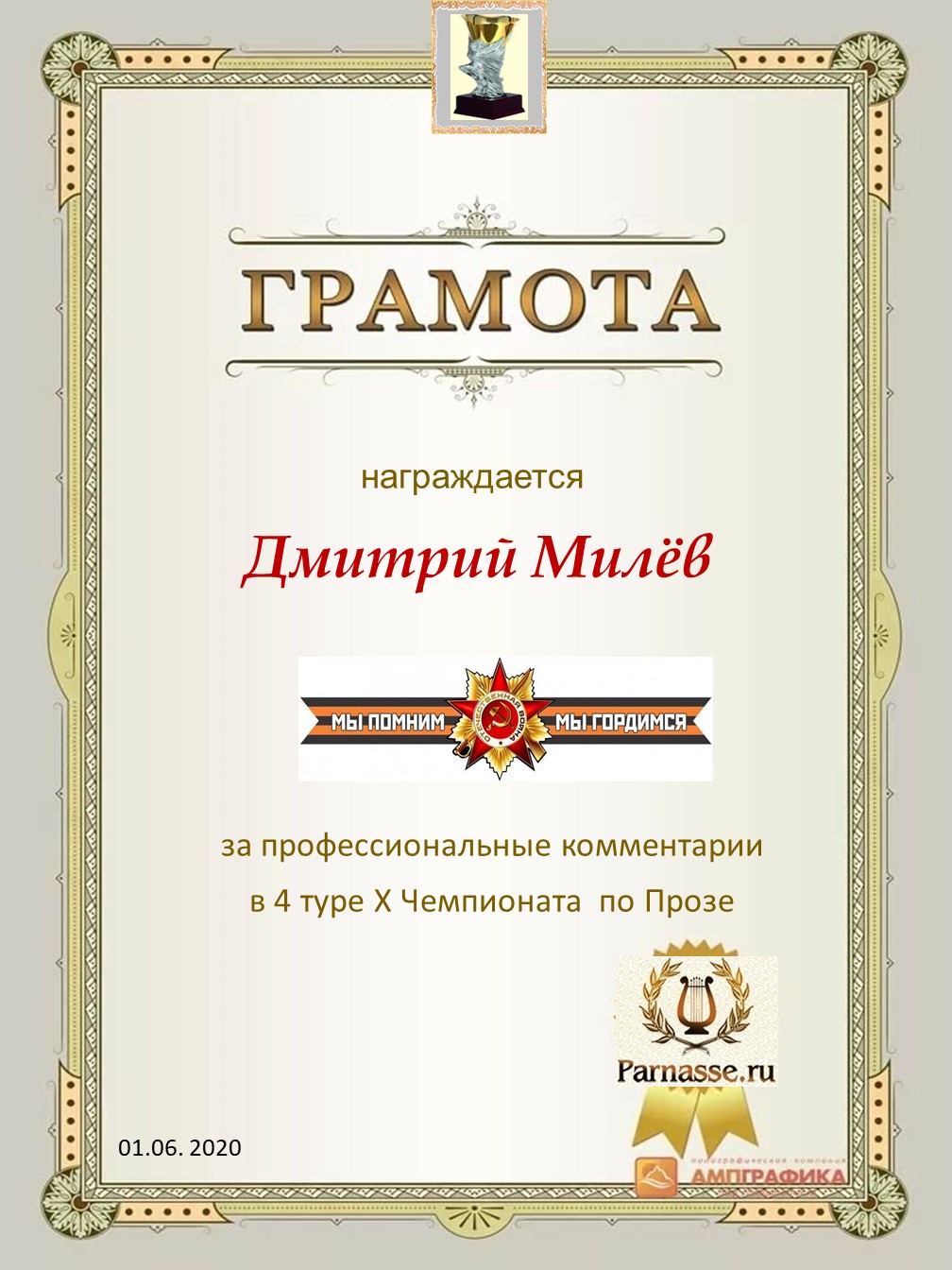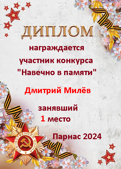 Первое место по решению Администрации и Главного судьи конкурса "Навечно в памяти"