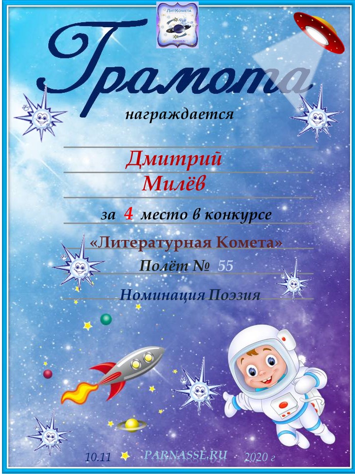 Поздравляю с занятым 4 местом в конкурсе "Литературная Комета - Полёт № 55" - Номинация Поэзия!