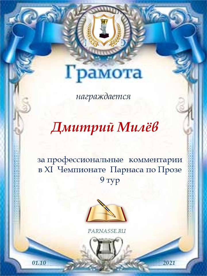 Благодарю за профессиональные комментарии в 9 туре XI Чемпионата Парнаса по Прозе!