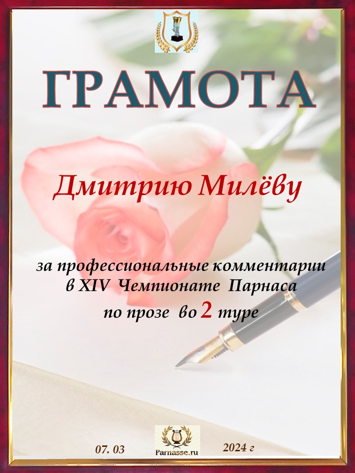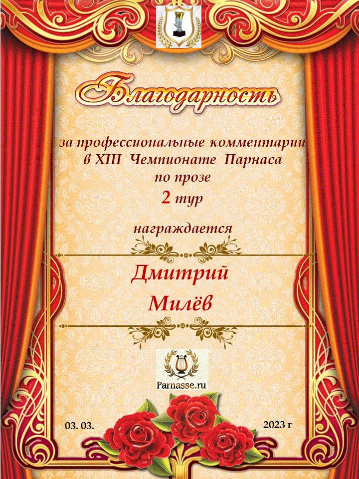 Большое спасибо за профессиональные и объективные комментарии во 2 туре X Чемпионата Парнаса по Прозе!