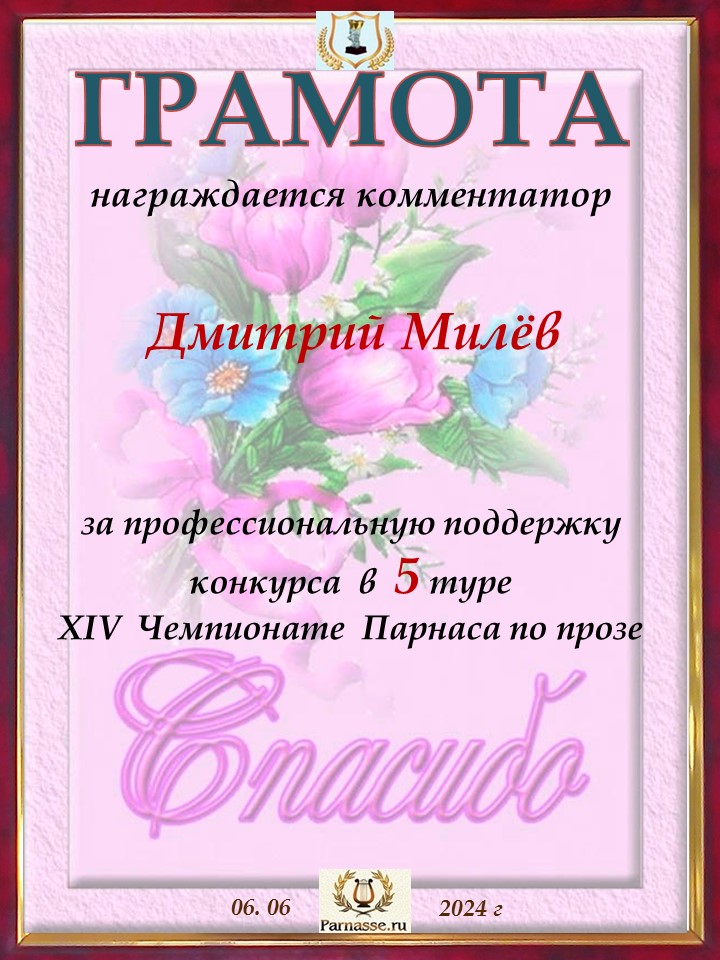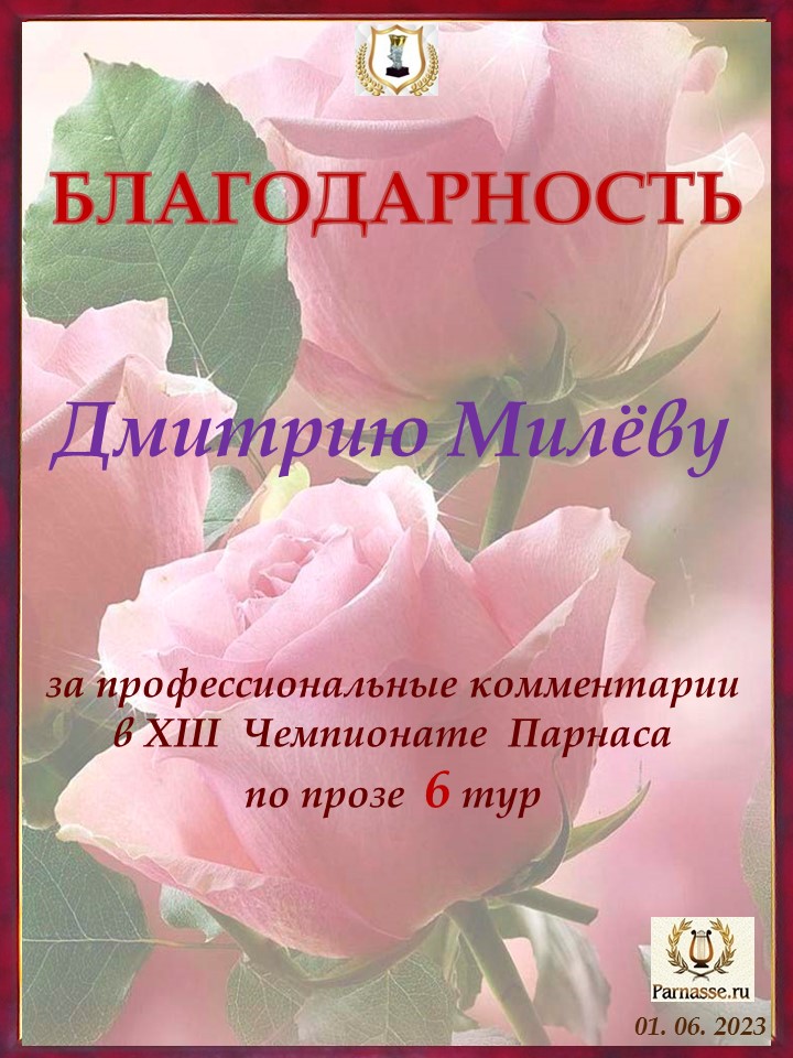 Большое спасибо за профессиональные и объективные комментарии в 6 туре X Чемпионата Парнаса по Прозе!