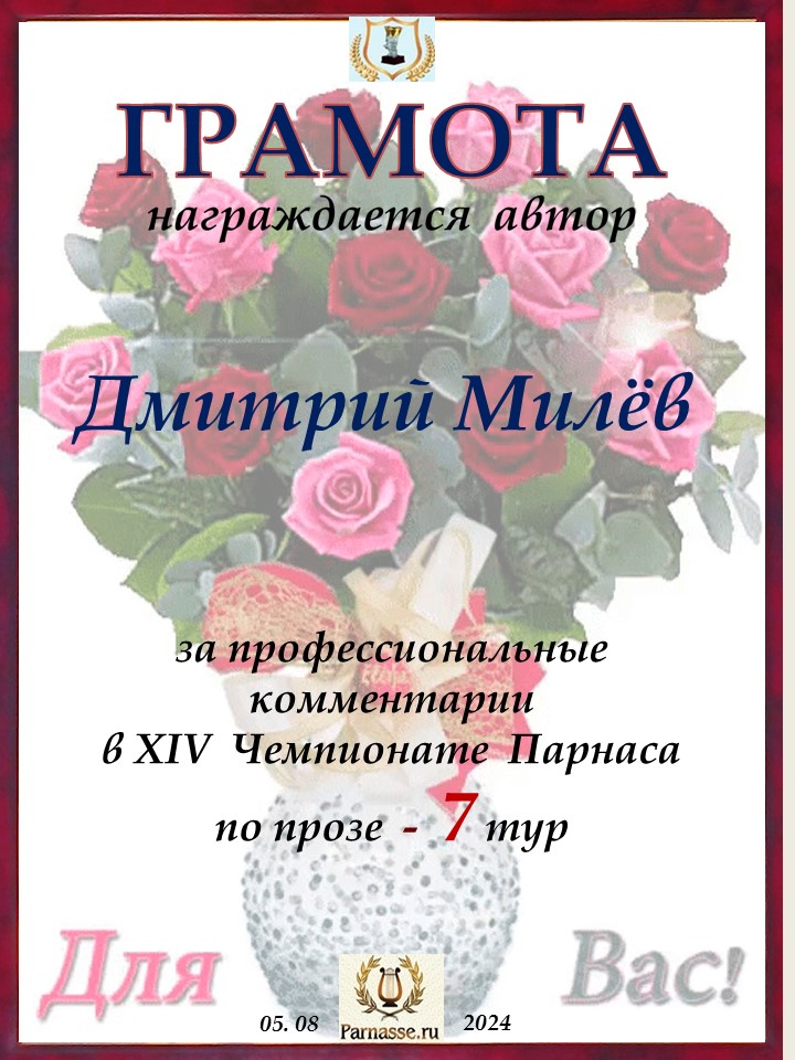 ![]() Медаль комментатора в 7 туре XIV Чемпионата Парнаса по прозе
