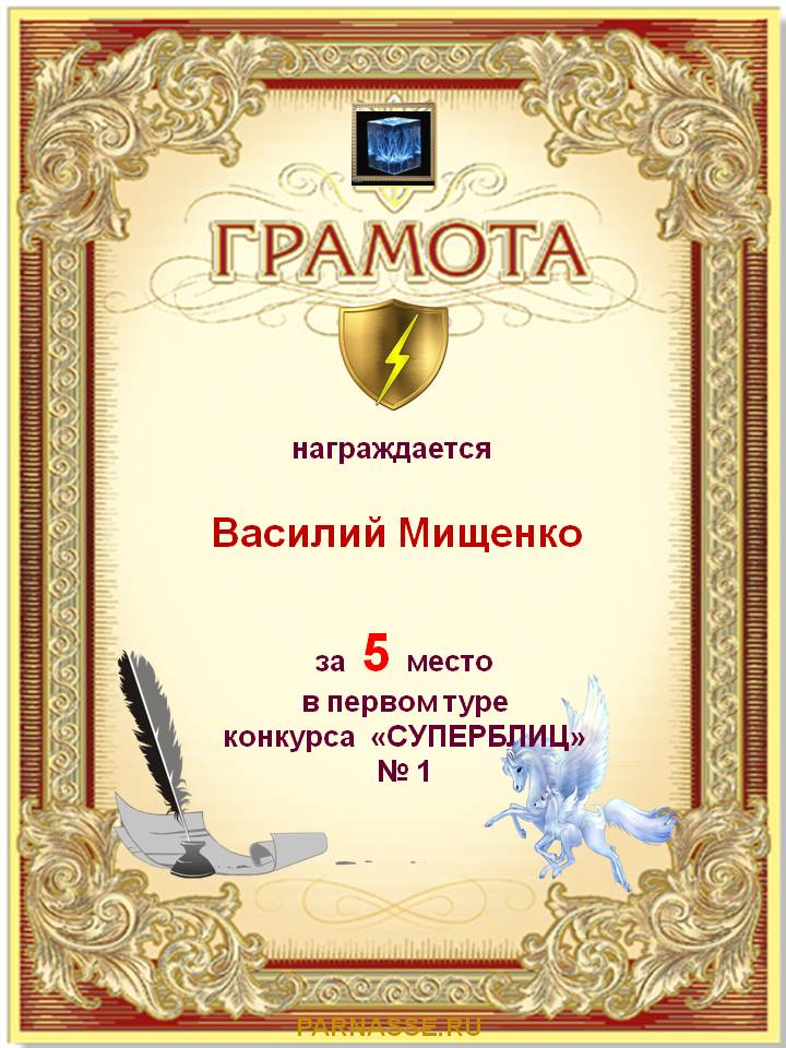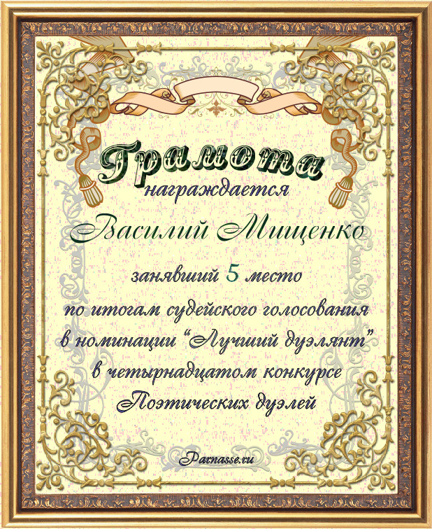 Грамота за 5-е место в номинации "ЛУЧШИЙ ДУЭЛЯНТ" по итогам судейского голосования в 14ом конкурсе поэтических дуэлей