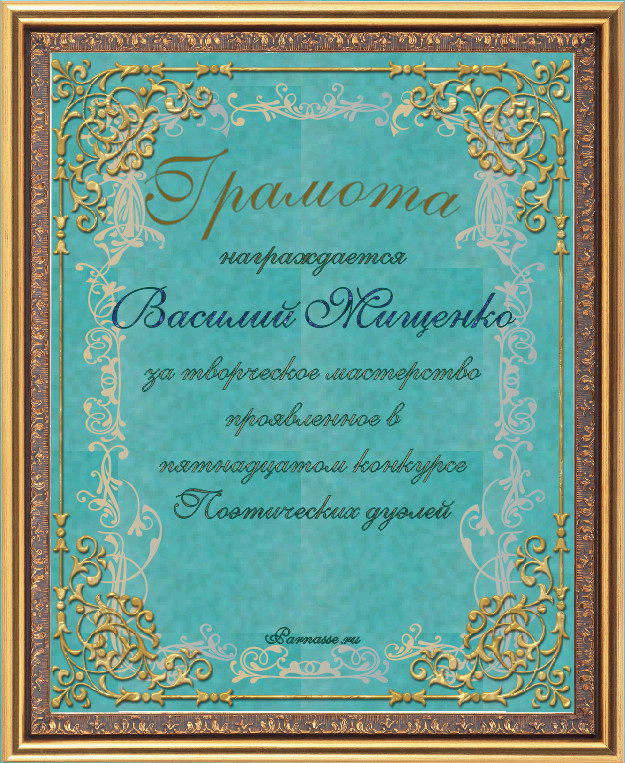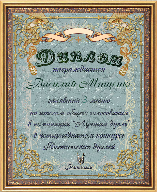 Диплом за 3-е место в номинации "ЛУЧШАЯ ДУЭЛЬ" по итогам общего голосования в 14ом конкурсе поэтических дуэлей (№ 16.1)
