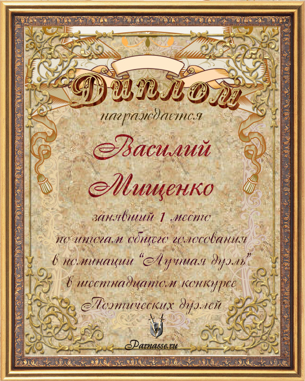 Диплом за 1-е место в номинации "ЛУЧШАЯ ДУЭЛЬ" по итогам общего голосования в 16ом конкурсе поэтических дуэлей (№ 10.1)
