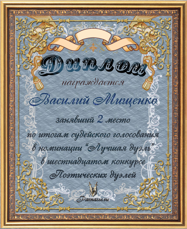 Диплом за 2-е место в номинации "ЛУЧШАЯ ДУЭЛЬ" по итогам общего голосования в 16ом конкурсе поэтических дуэлей (№ 10.1)