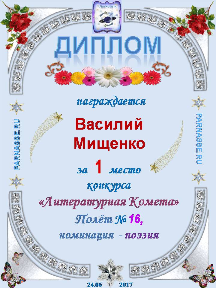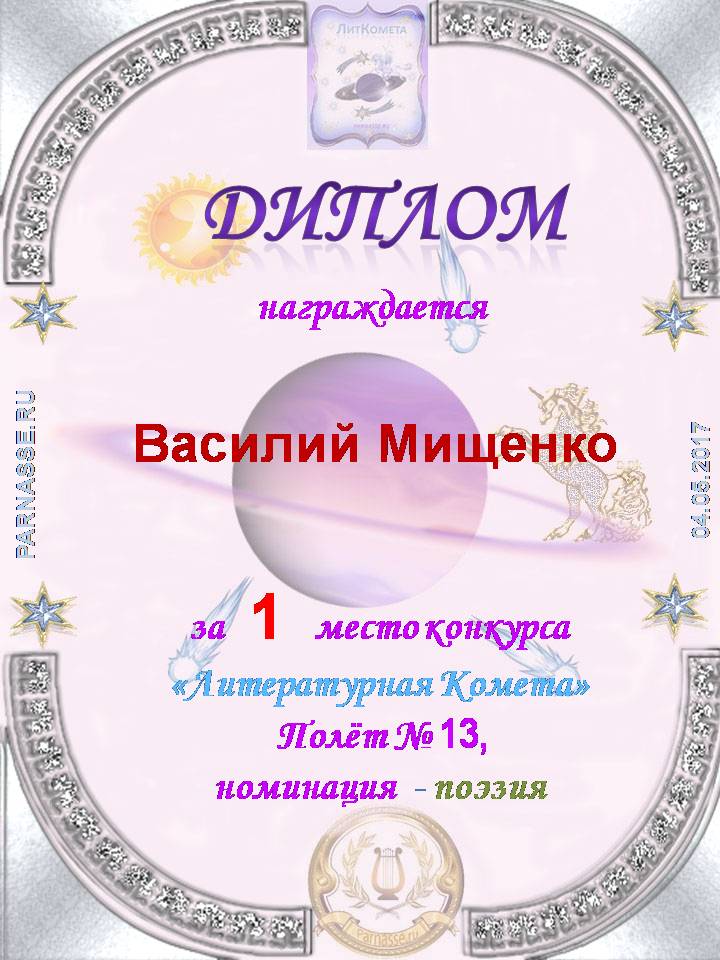Диплом за 1 место в конкурсе "ЛитКомета"- Полёт № 13 - поэзия