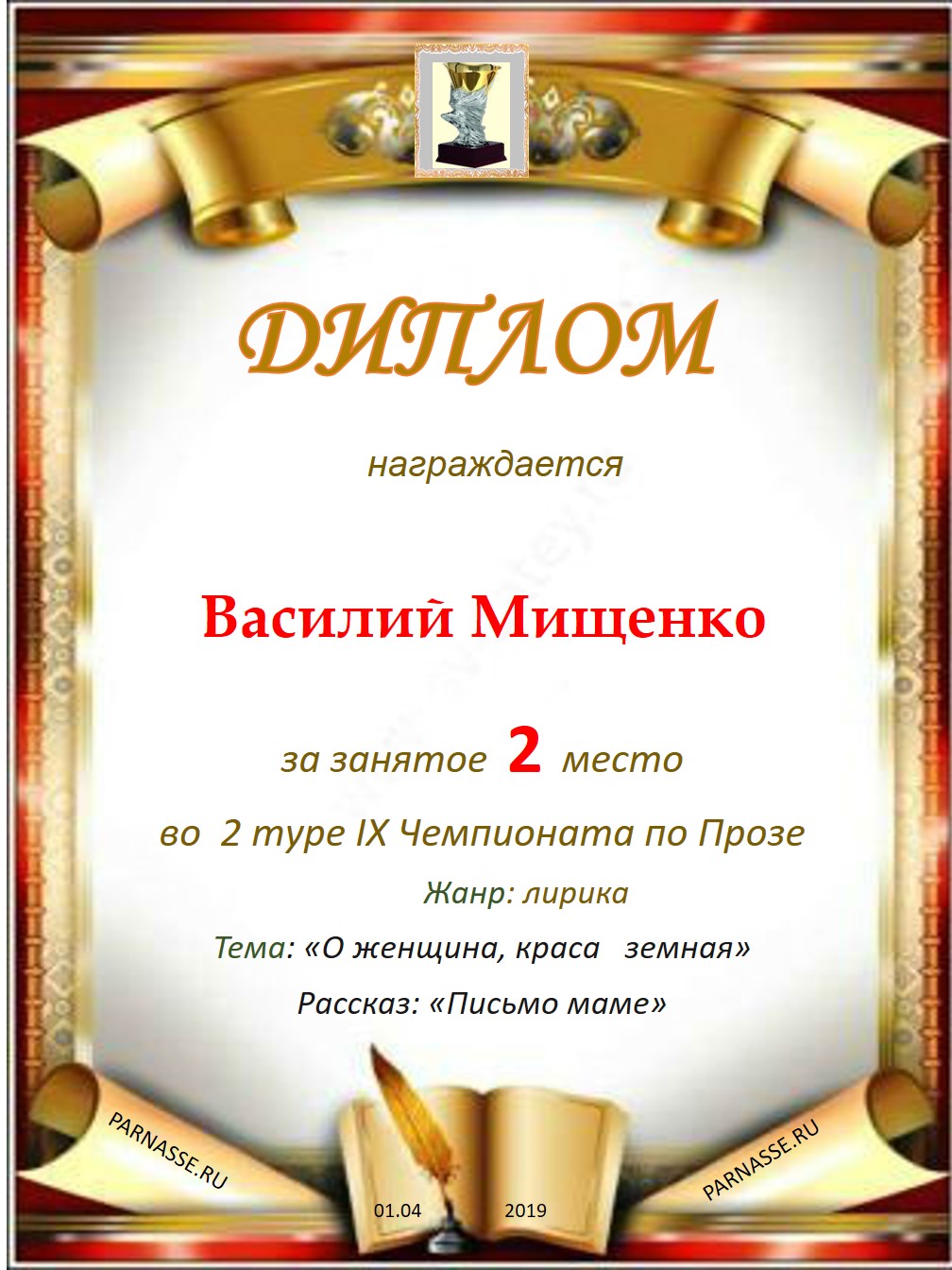 ![]() ![]() Медаль за 1 место во 2 туре XIII Чемпионата Парнаса по прозе