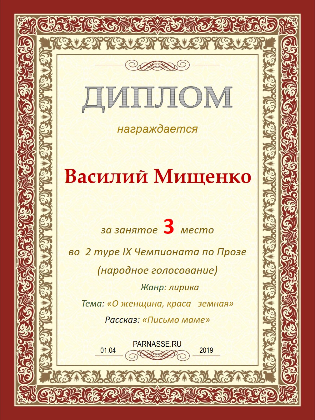 Поздравляю с занятым 3 местом в 9 туре XII Чемпионата Парнаса по прозе!