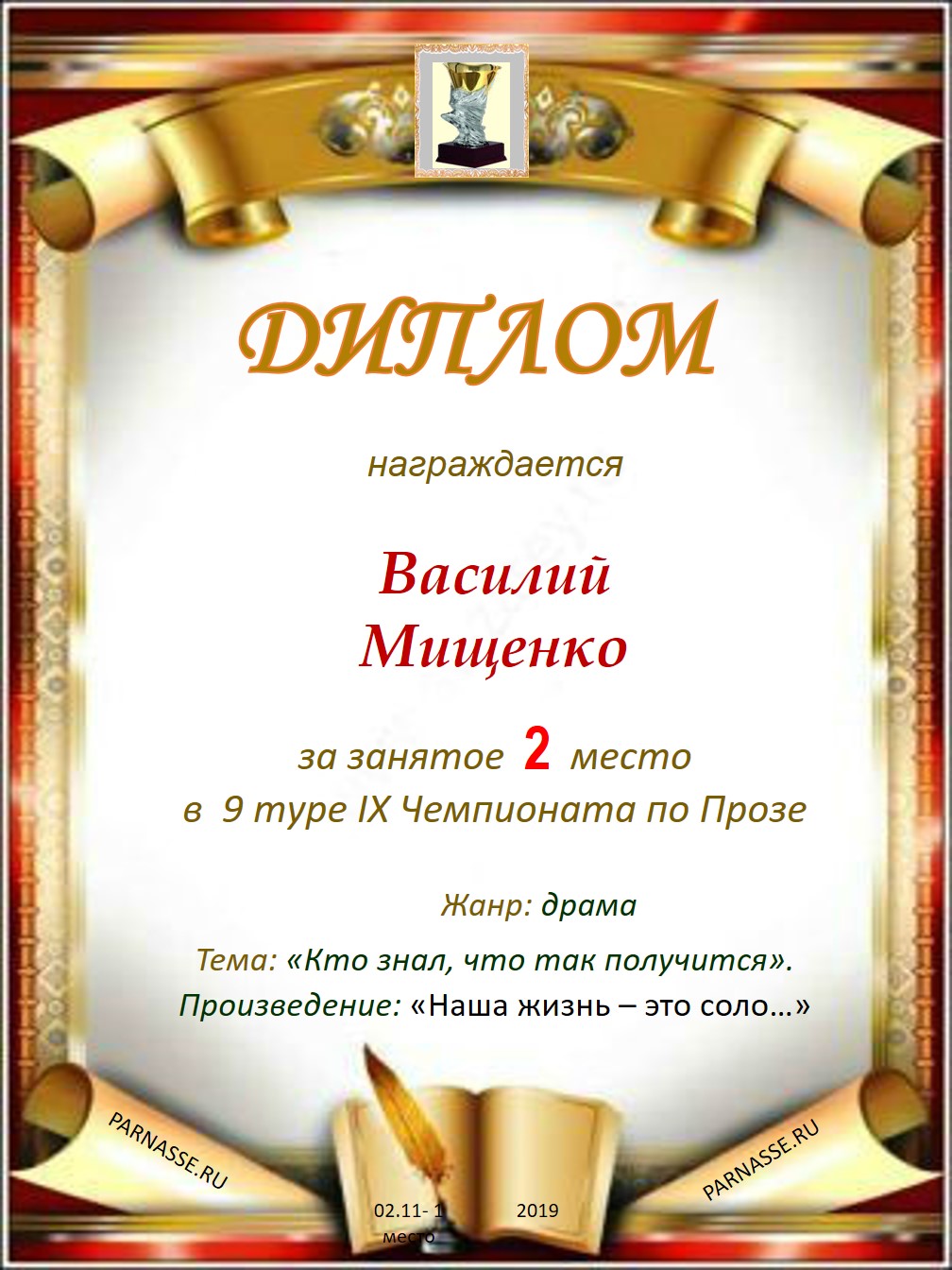 ![]() Медаль за 1 место в 9 туре XIII Чемпионата Парнаса по прозе