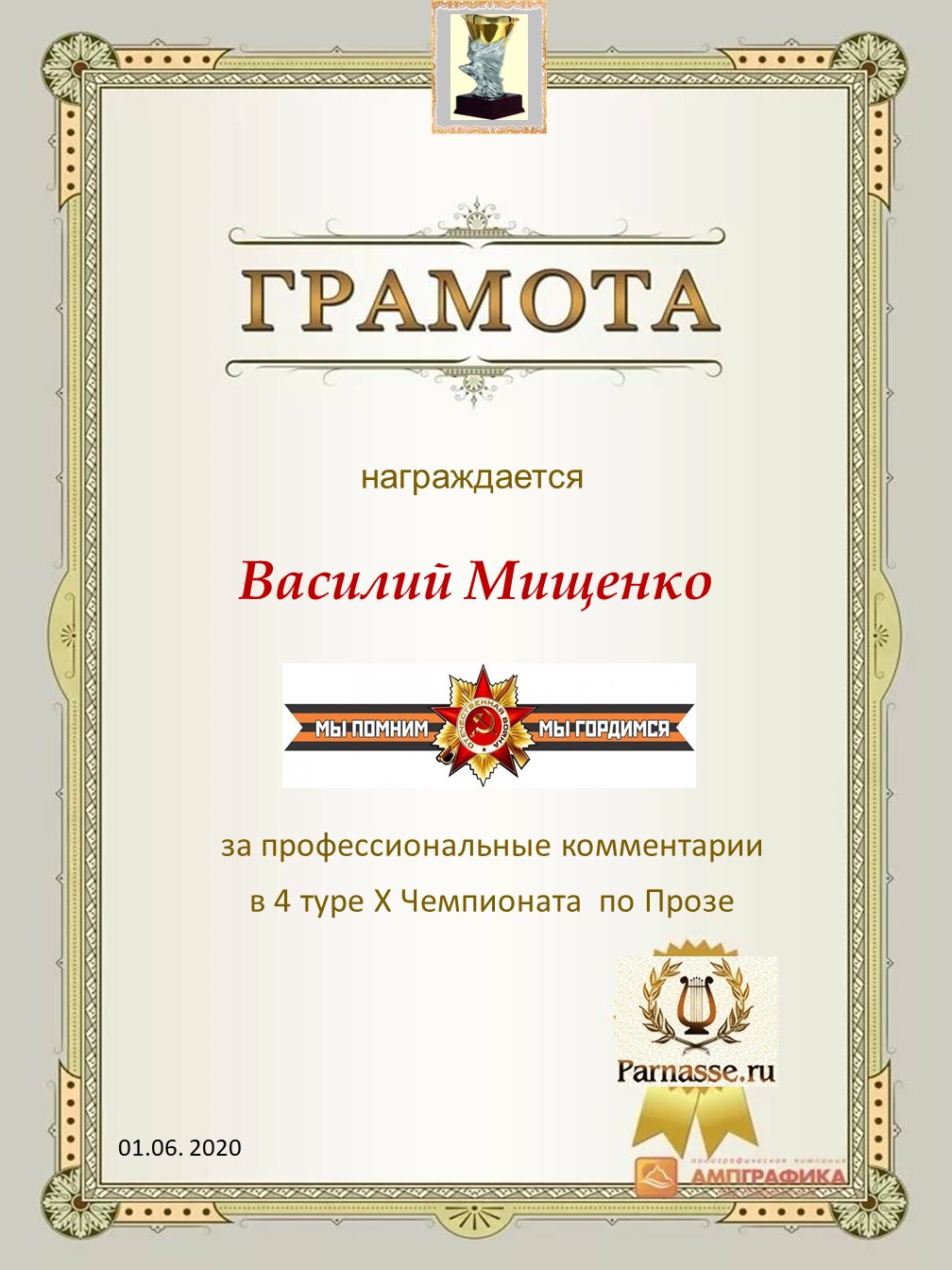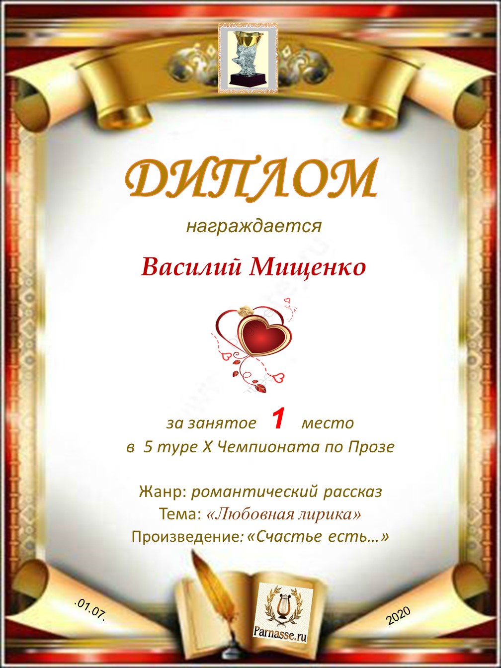 Поздравляю с занятым 1 местом в 4 туре X Чемпионата Парнаса по Прозе!