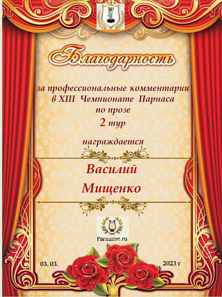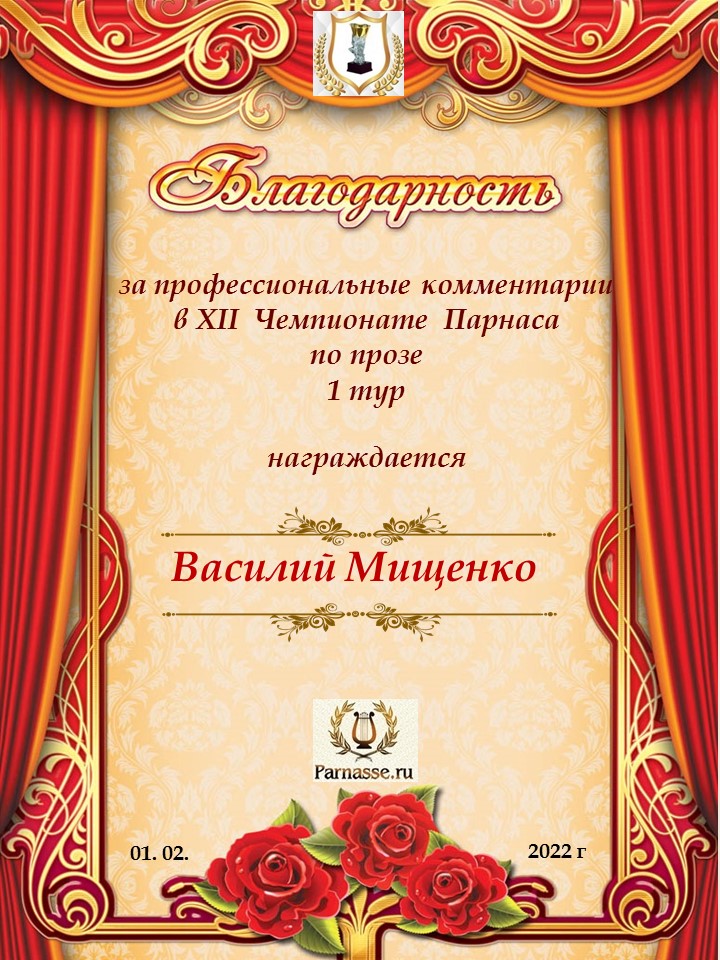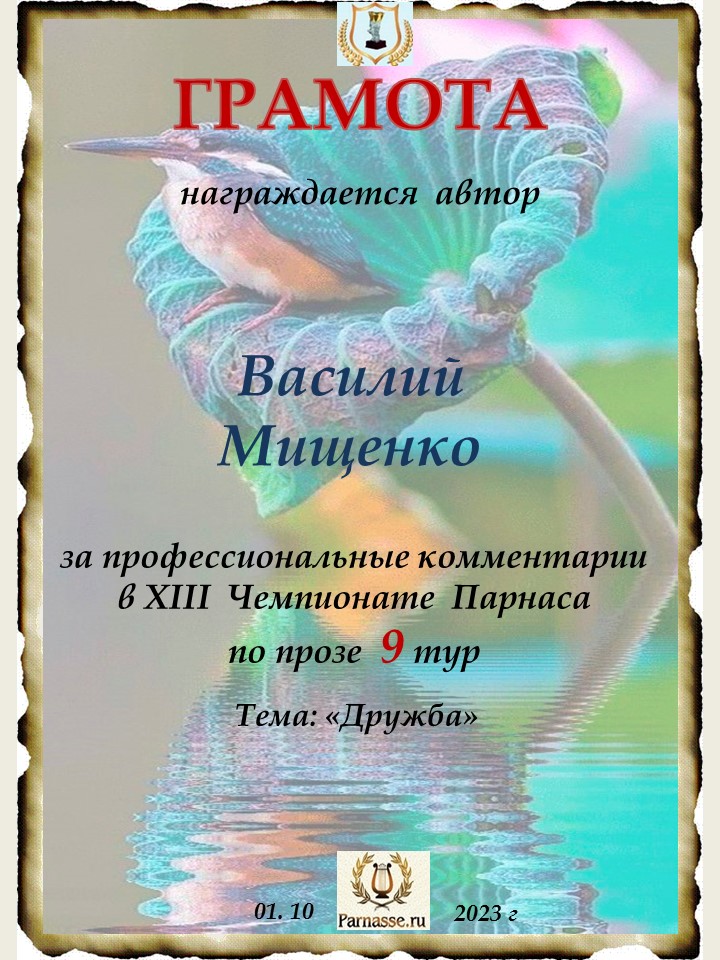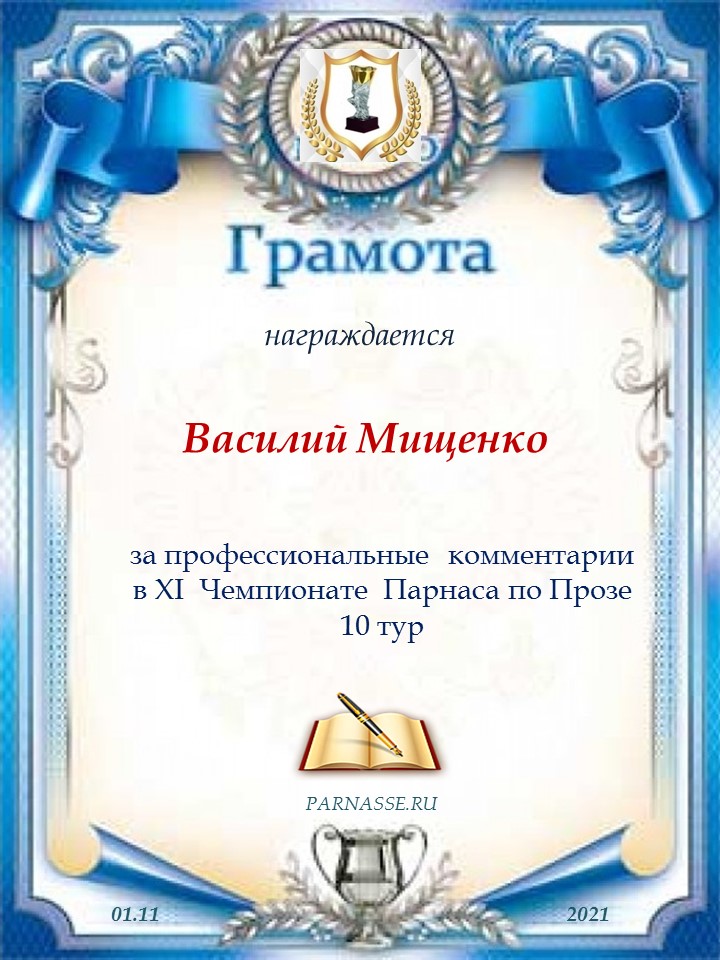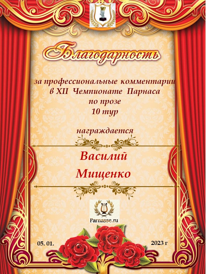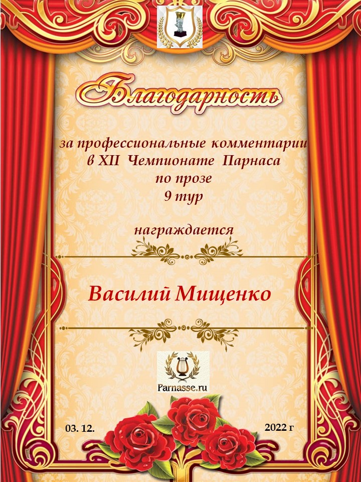 Благодарю за профессиональные комментарии в 9 туре XI Чемпионата Парнаса по Прозе!