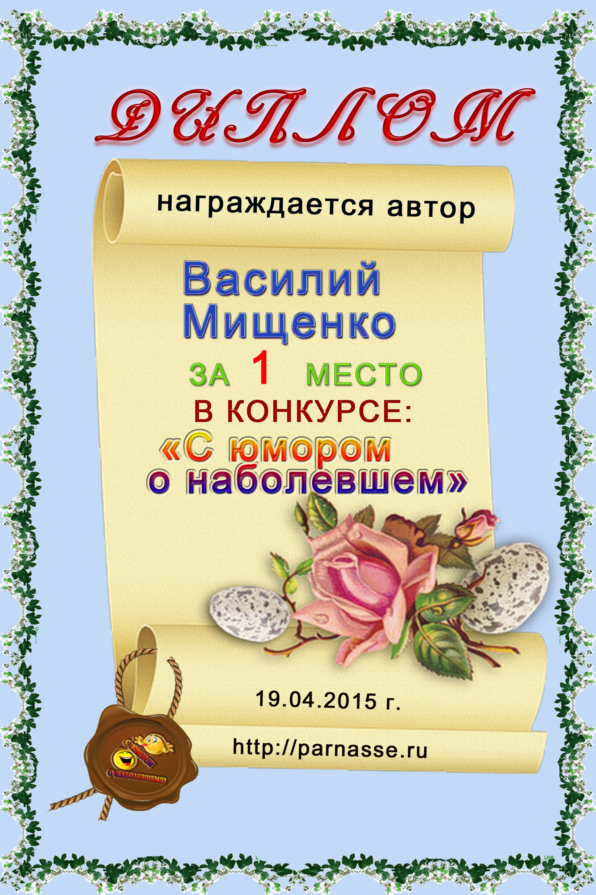 Диплом за 1 место в конкурсе "С юмором. о наболевшем!№7