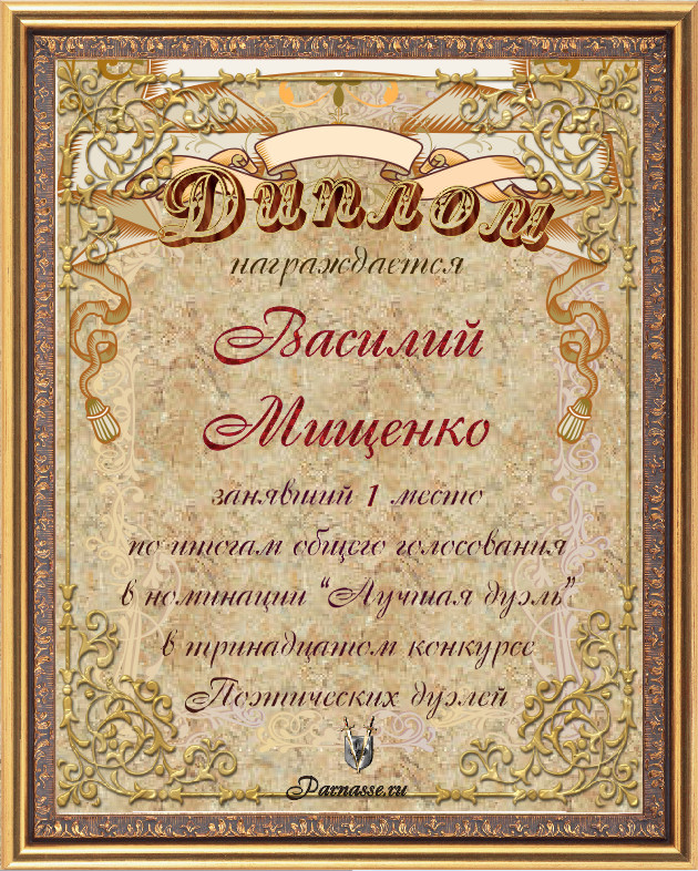 Диплом за 1-е место в номинации "ЛУЧШАЯ ДУЭЛЬ" по итогам общего голосования в 13м конкурсе поэтических дуэлей (№ 7.1)