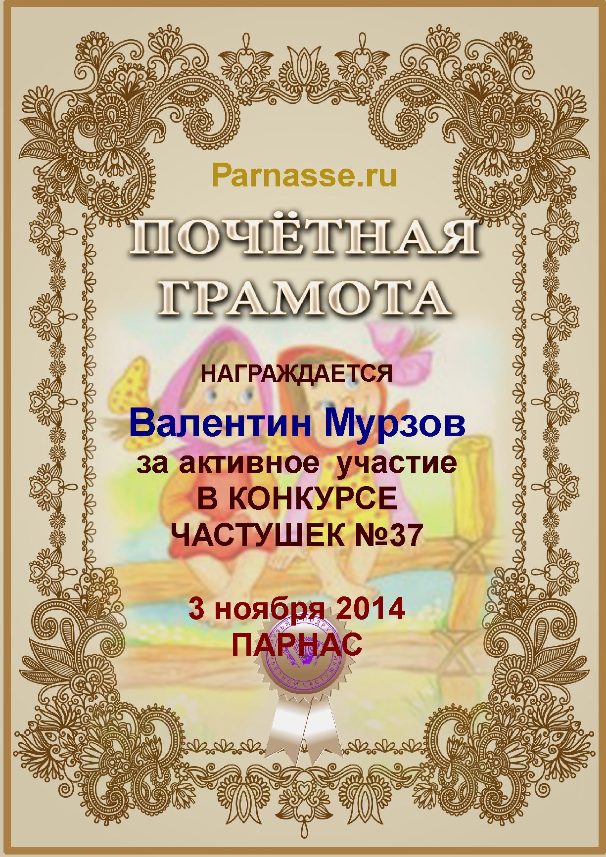 Похвальная грамота за активное участие в конкурсе лимериков № 62+ (24.11.2014 г.)