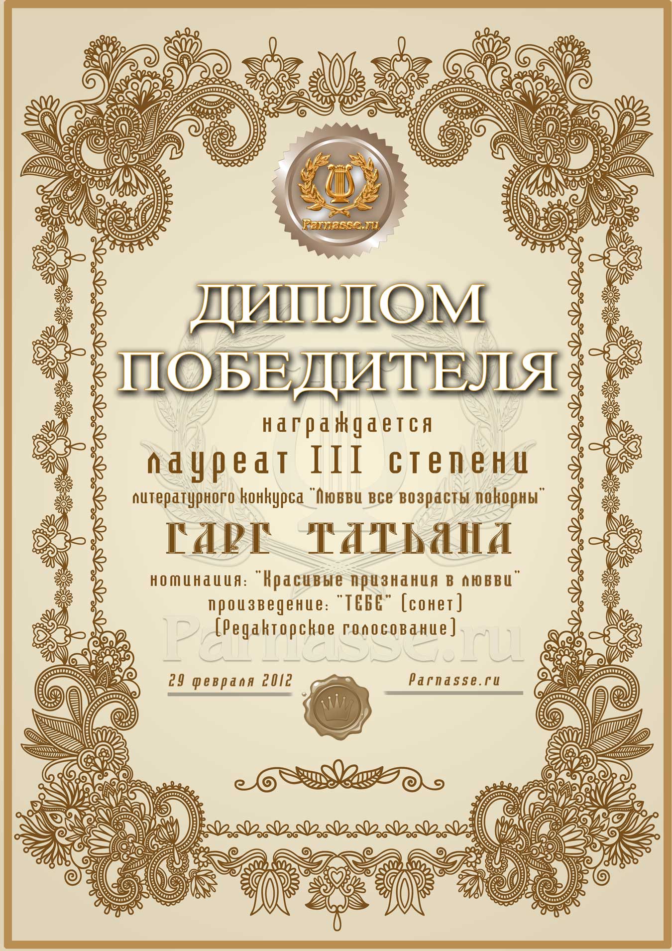 Диплом лауреата III степени лит.конкурса "Любви все возрасты покорны"