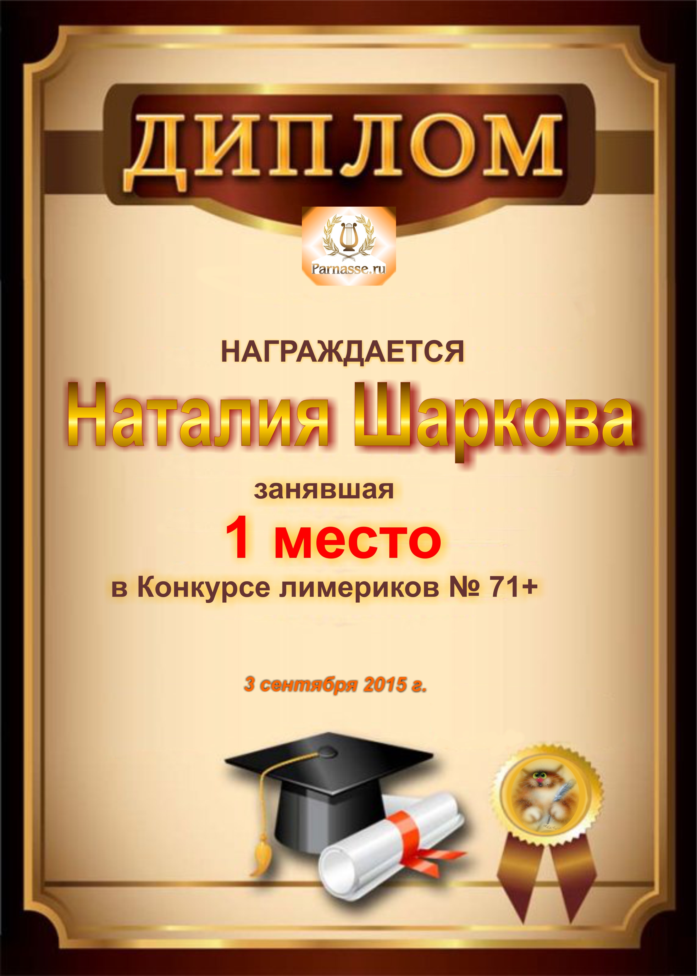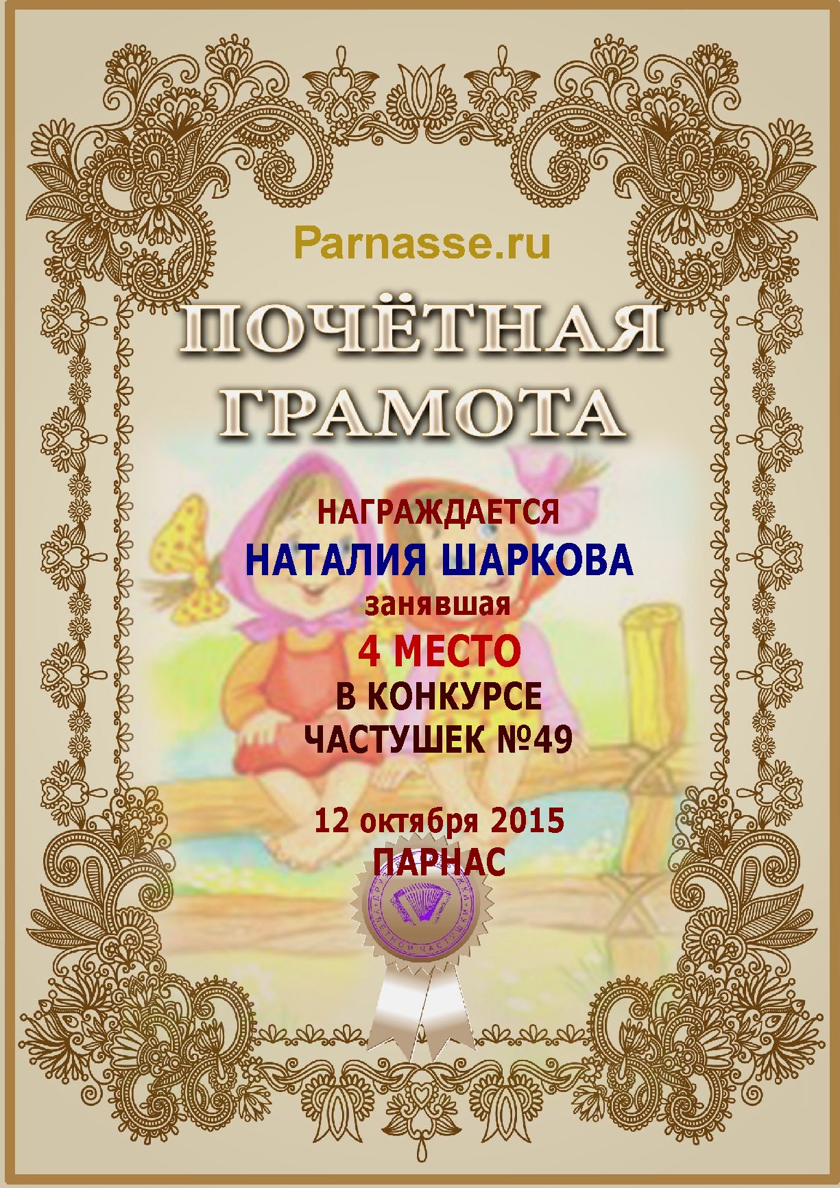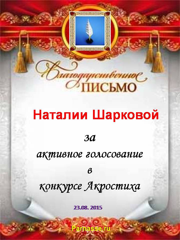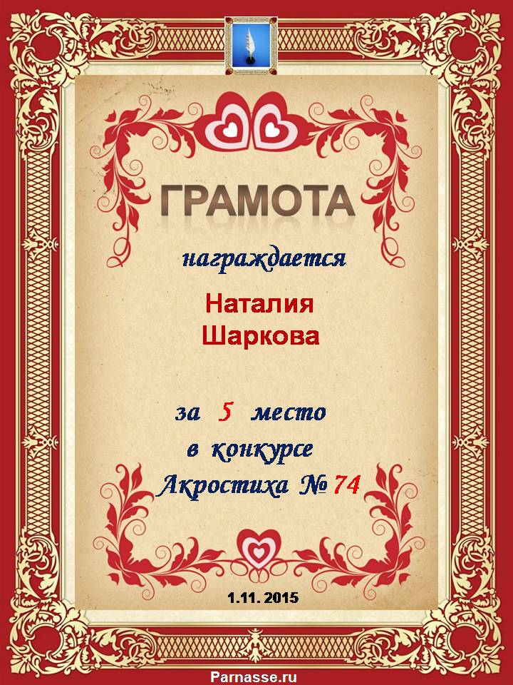 Похвальная грамота за 4 место и активное участие в конкурсе лимериков № 71+ (03.09.2015 г.)