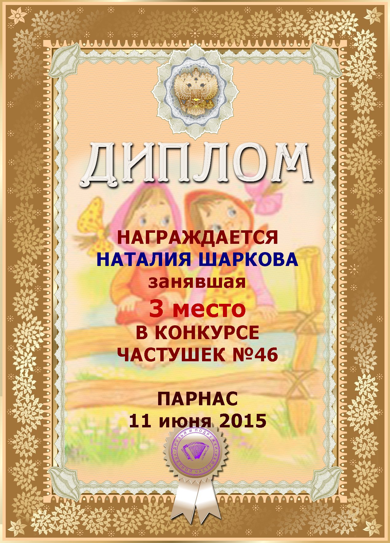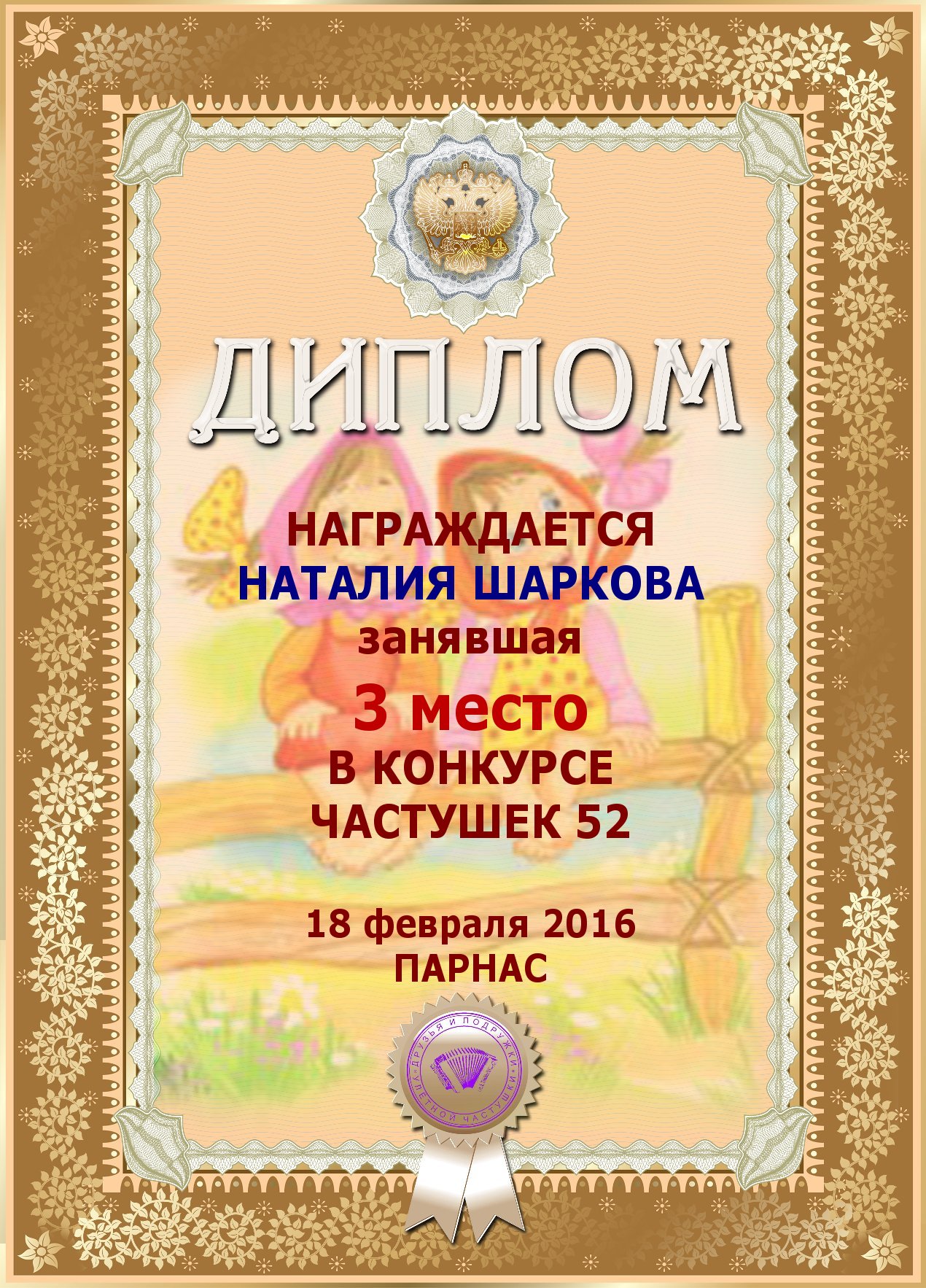 Третье место по итогам конкурса «Ветер снова мне шепчет о счастье ", народное голосование. Поздравляем с прекрасной победой!