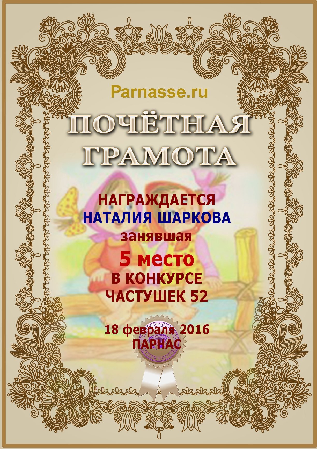 Похвальная грамота за 5 место и активное участие в конкурсе лимериков № 70+ (29.06.2015 г.)