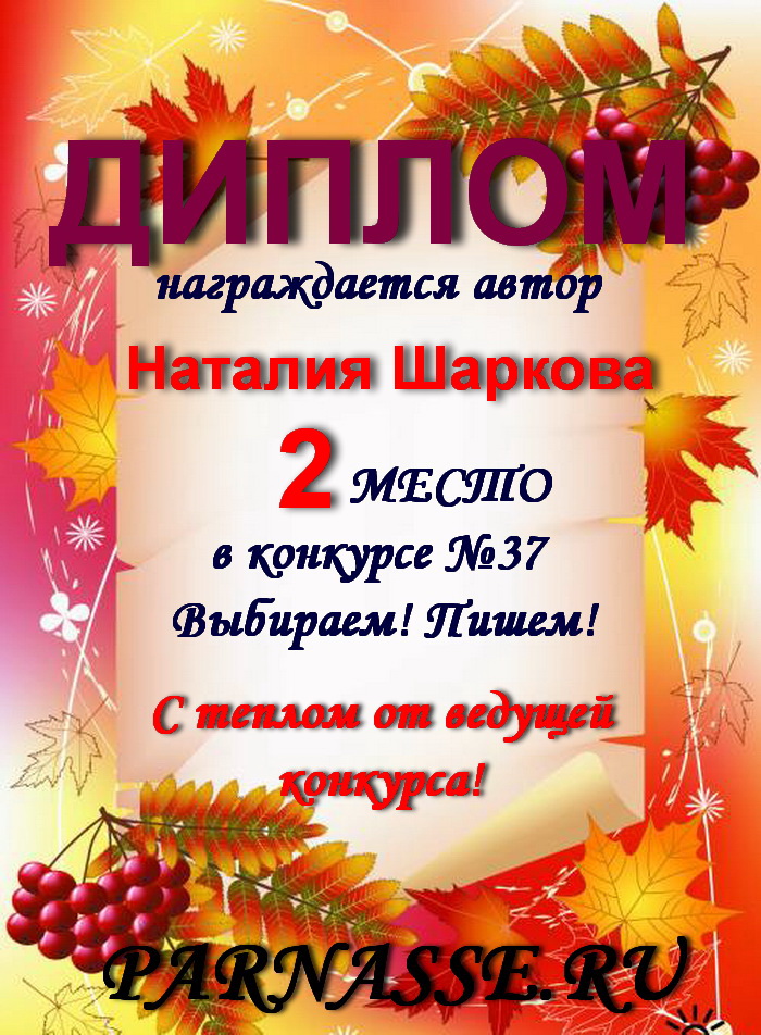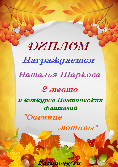 Третье место в конкурсе "Золотом рассыпался сентябрь", в поэтической номинации "Очей очарование", судейское голосование. Поздравляем!