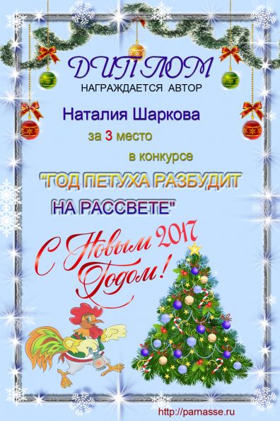 За участие в поэтическом конкурсе "Декабрь – чудес и новогодних сказок время", номинация "Декабрьская сказка". Пусть счастье, любовь, здоровье и удача будут вашими верными спутниками каждый день из года в год!