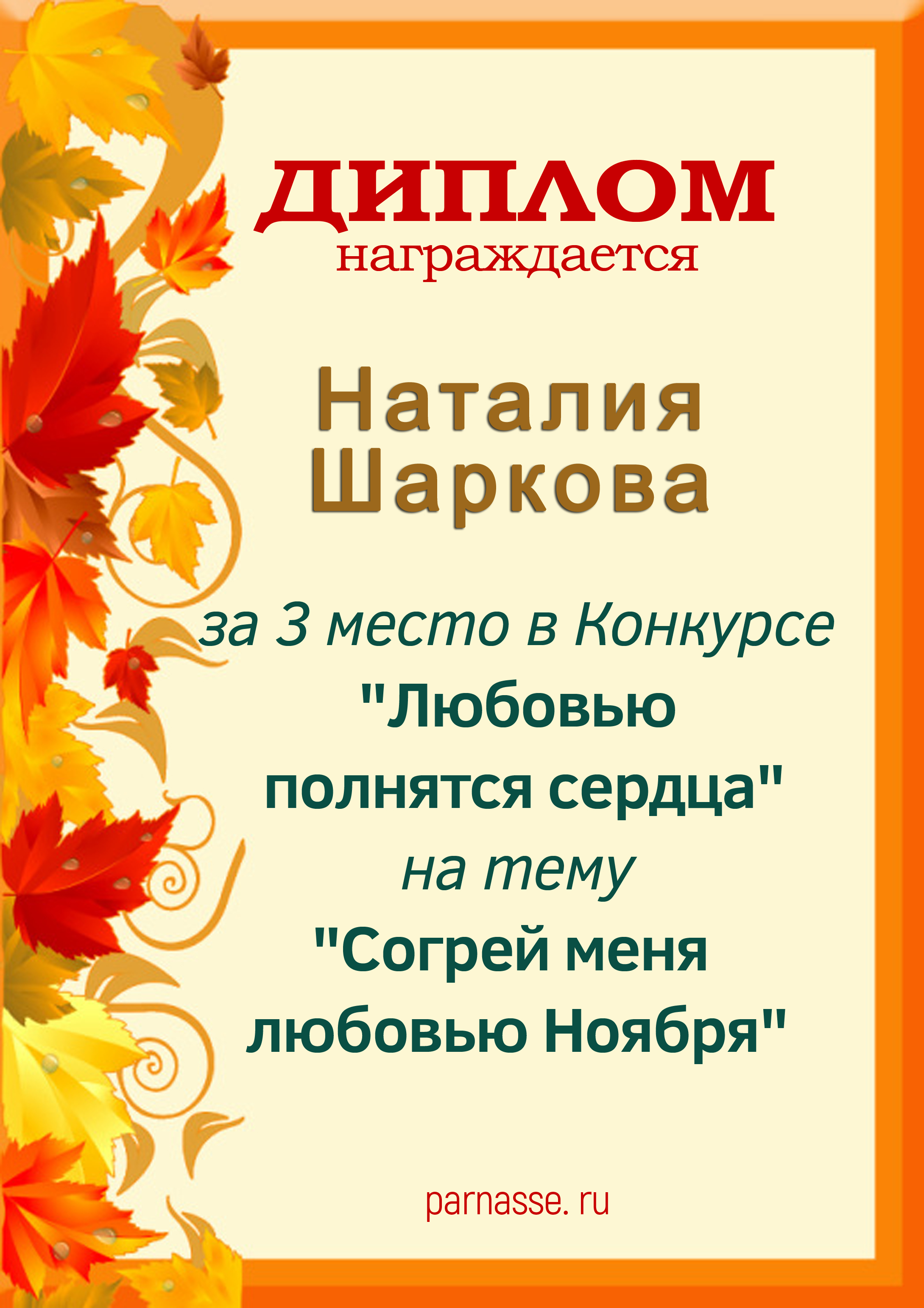 За 3 место в Конкурсе "Любовью полнятся сердца" на тему "Согрей меня любовью Ноября"