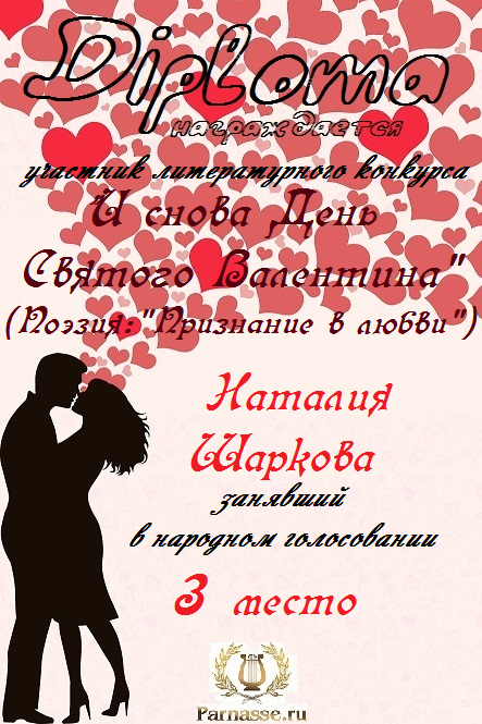 Третье место в конкурсе "И снова День Святого Валентина", в поэтической номинации "Признание в любви ", народное голосование. Поздравляем с прекрасной победой!