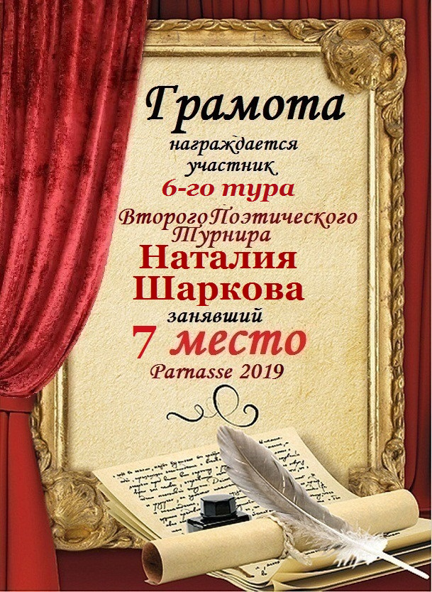 Восьмое место в 5-м туре Первого Поэтического Турнира «Наедине с бумагой и пером» за произведение «ТЕБЕ ПИШУ». Поздравляем!