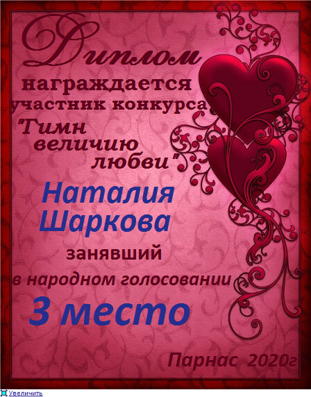 Третье место по итогам конкурса " Любовь – возвышенное чувство", народное голосование. Поздравляем с прекрасной победой!
