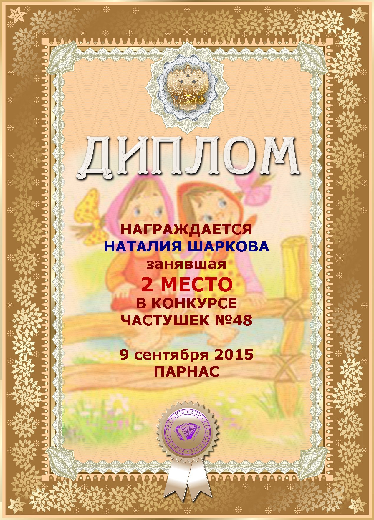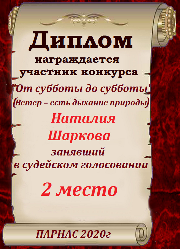 Второе место по итогам конкурса «Ветер снова мне шепчет о счастье ", по итогам судейского голосования. Поздравляем с прекрасной победой!