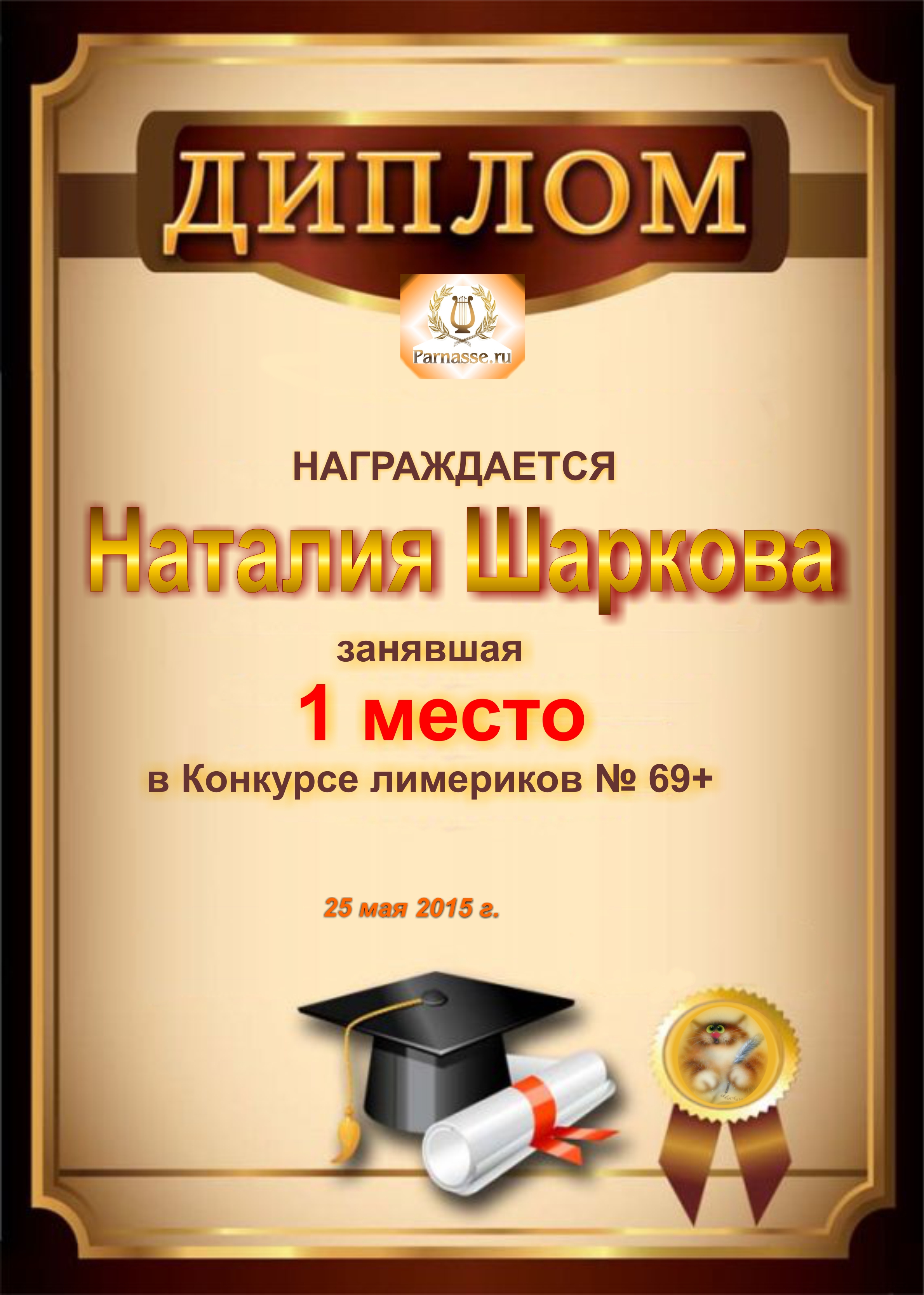 Похвальная грамота за 4 место и активное участие в конкурсе лимериков № 69+ (25.05.2015 г.)