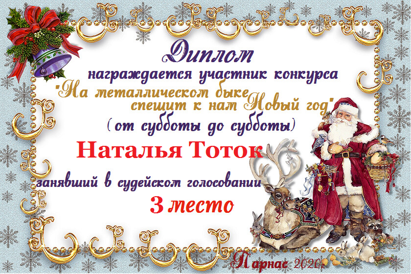 Третье место по итогам литературного конкурса «Пусть будет щедрым Новый год» , судейское голосование. Поздравляем с прекрасной победой!