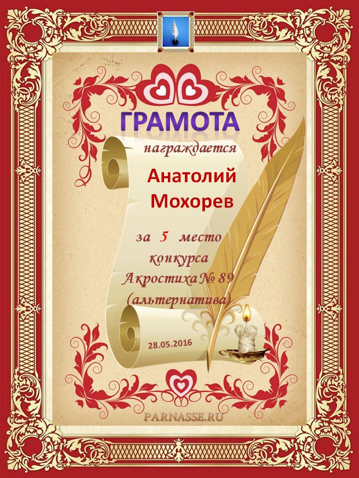 Грамота за 5 место в 102 конкурсе АКРОСТИХА (Альтернатива)! ПОЗДРАВЛЯЮ!