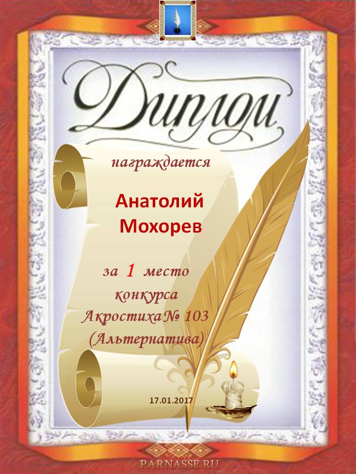 Диплом за 1 место в 103 конкурсе АКРОСТИХА (Альтернатива)! ПОЗДРАВЛЯЮ!