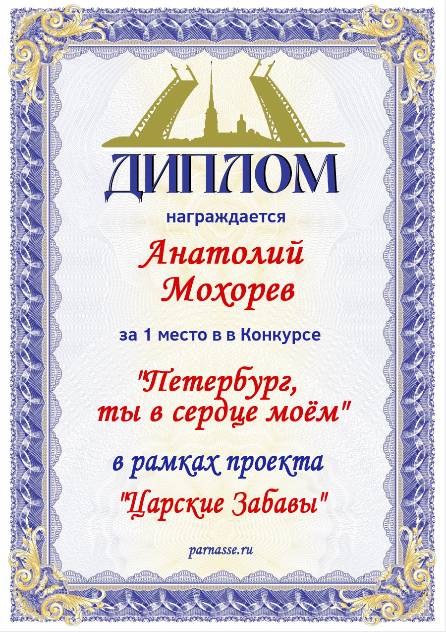 За 1 место в Конкурсе "Петербург, ты в сердце моём!" в рамках проекта "Царские Забавы"