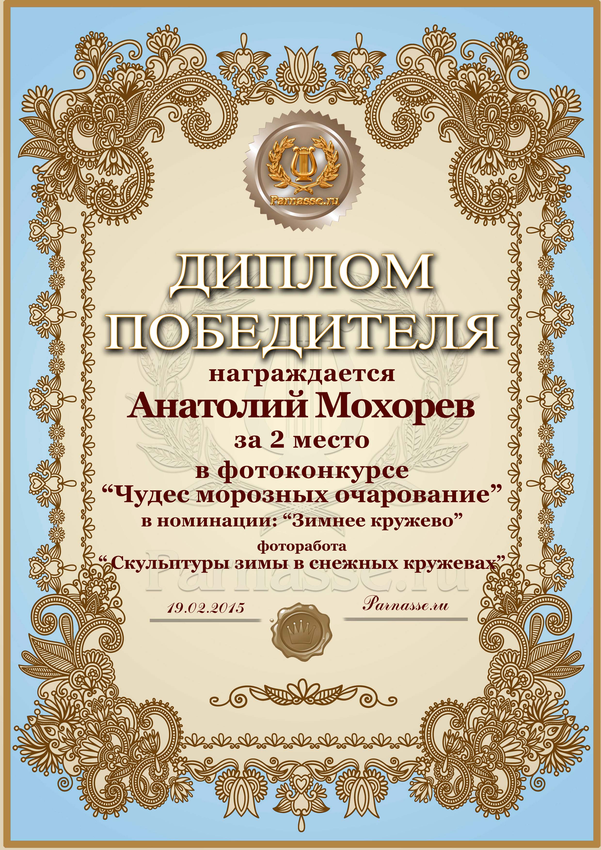 Диплом за 2 место в фотоконкурсе "Чудес морозных очарование"