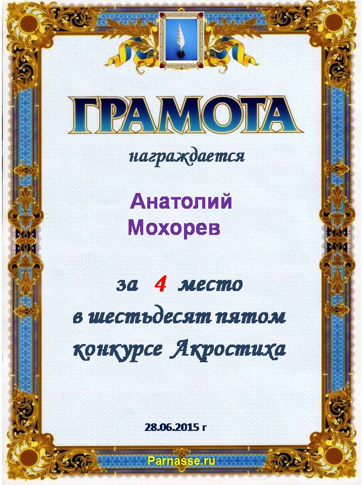 Грамота за 4 место в 142 конкурсе АКРОСТИХА (Альтернатива)! ПОЗДРАВЛЯЮ!