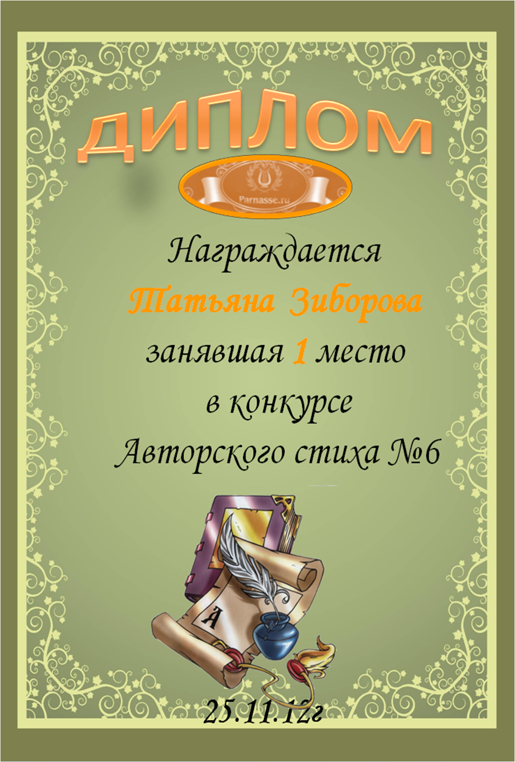 Диплом, за первое место в конкурсе Авторского стиха №6! ПОЗДРАВЛЯЕМ!!! ЖЕЛАЕМ ДАЛЬНЕЙШИХ ТВОРЧЕСКИХ УСПЕХОВ И ПОБЕД!!!