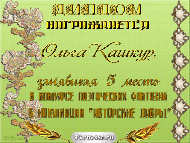 Первое место в праздничном конкурсе "ПОЗДРАВИМ ПАРНАС ВМЕСТЕ!", в номинации "Лучшее стихотворное поздравление Парнасу". Позвольте от всей души выразить Вам благодарность за прекрасные поэтические слова поддержки, самые тёплые пожелания нашему Парнасу и пожелать Вам новых побед на литературном поприще, успехов в жизни и всех Ваших начинаниях! Будьте счастливы, здоровы, пусть удача не покидает Вас ни на минуту и от всей души СПАСИБО! Оставайтесь с нами и мы будем вновь и вновь встречать Дни рождения "Парнаса" в одной дружной, душевной компании! Произведение "ПАРНАСУ"