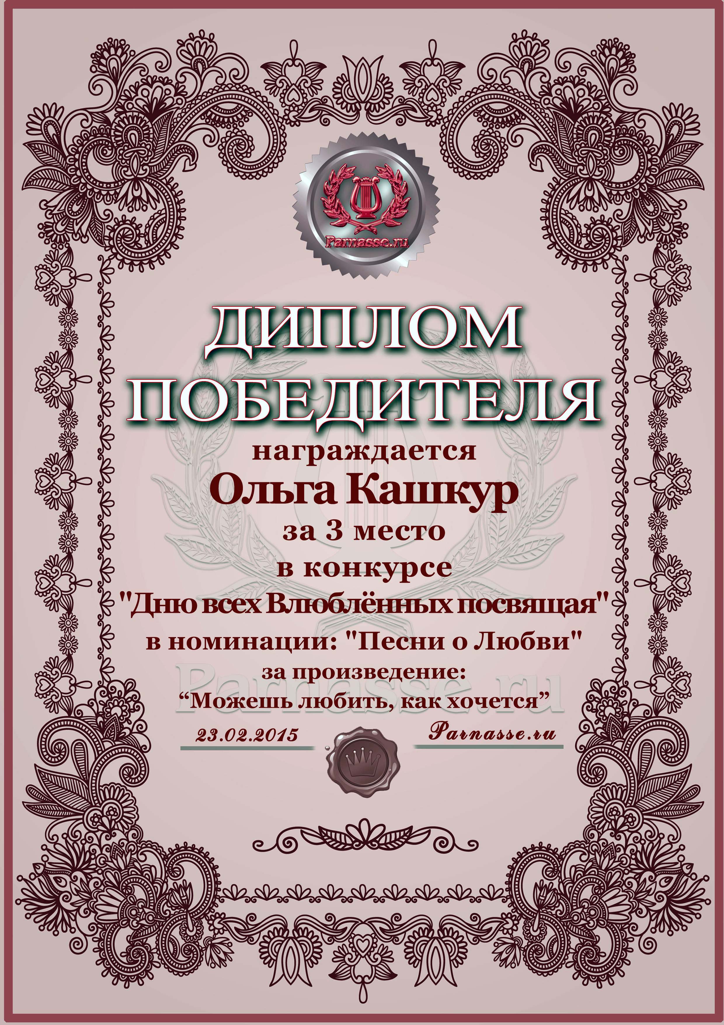 Диплом за 3 место в конкурсе "Дню всех Влюблённых посвящая"