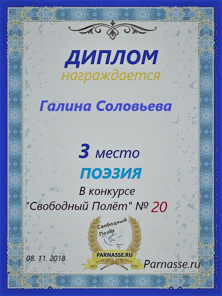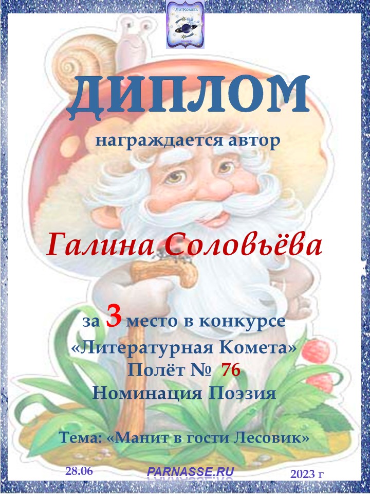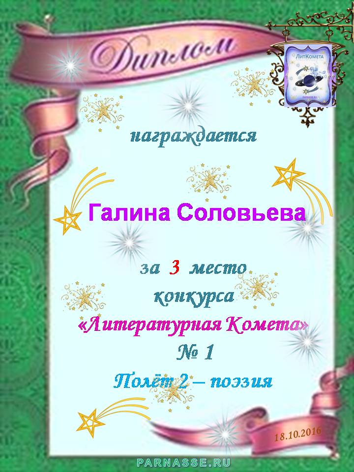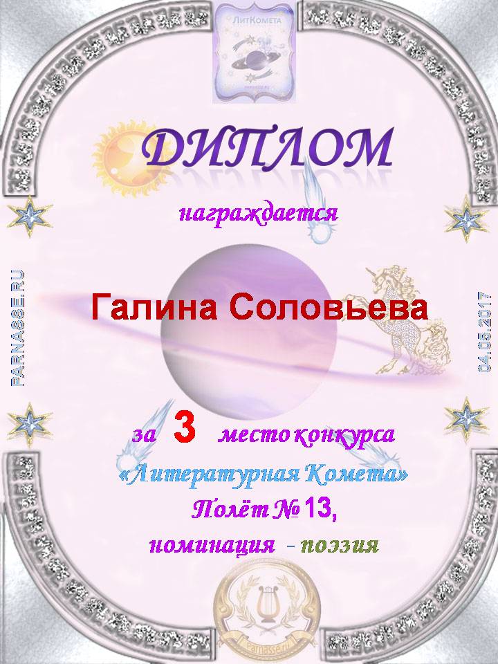 Диплом за 3 место в конкурсе "ЛитКомета"- Полёт № 13 - поэзия