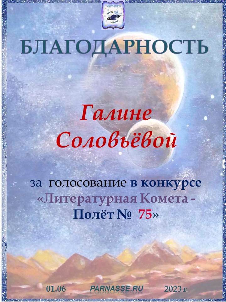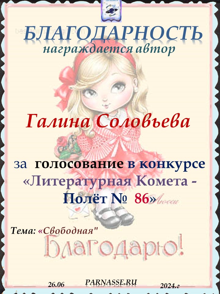 Спасибо за голосование в конкурсе "ЛитКомета - Полёт № 84"! Очень важна Ваша поддержка!