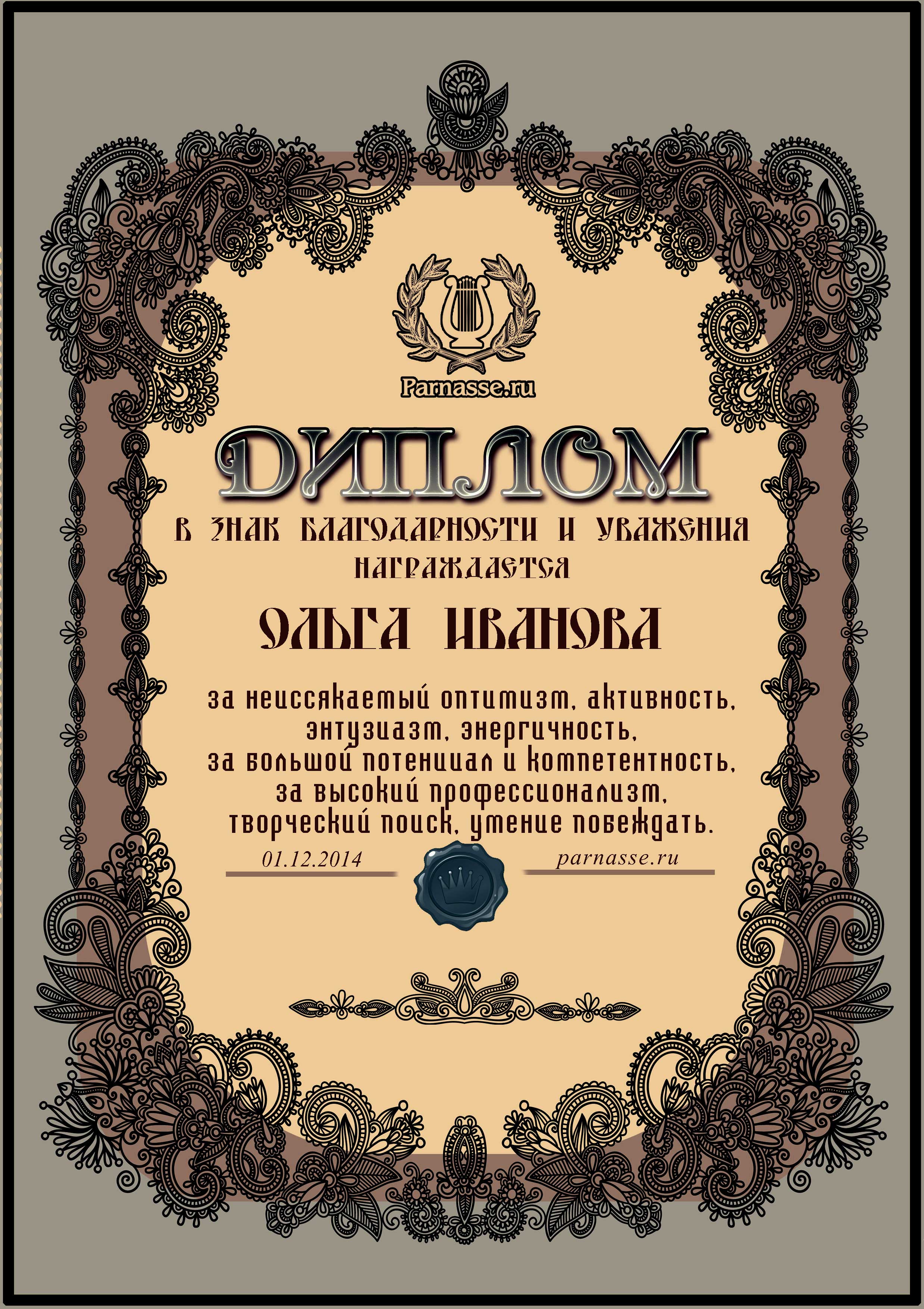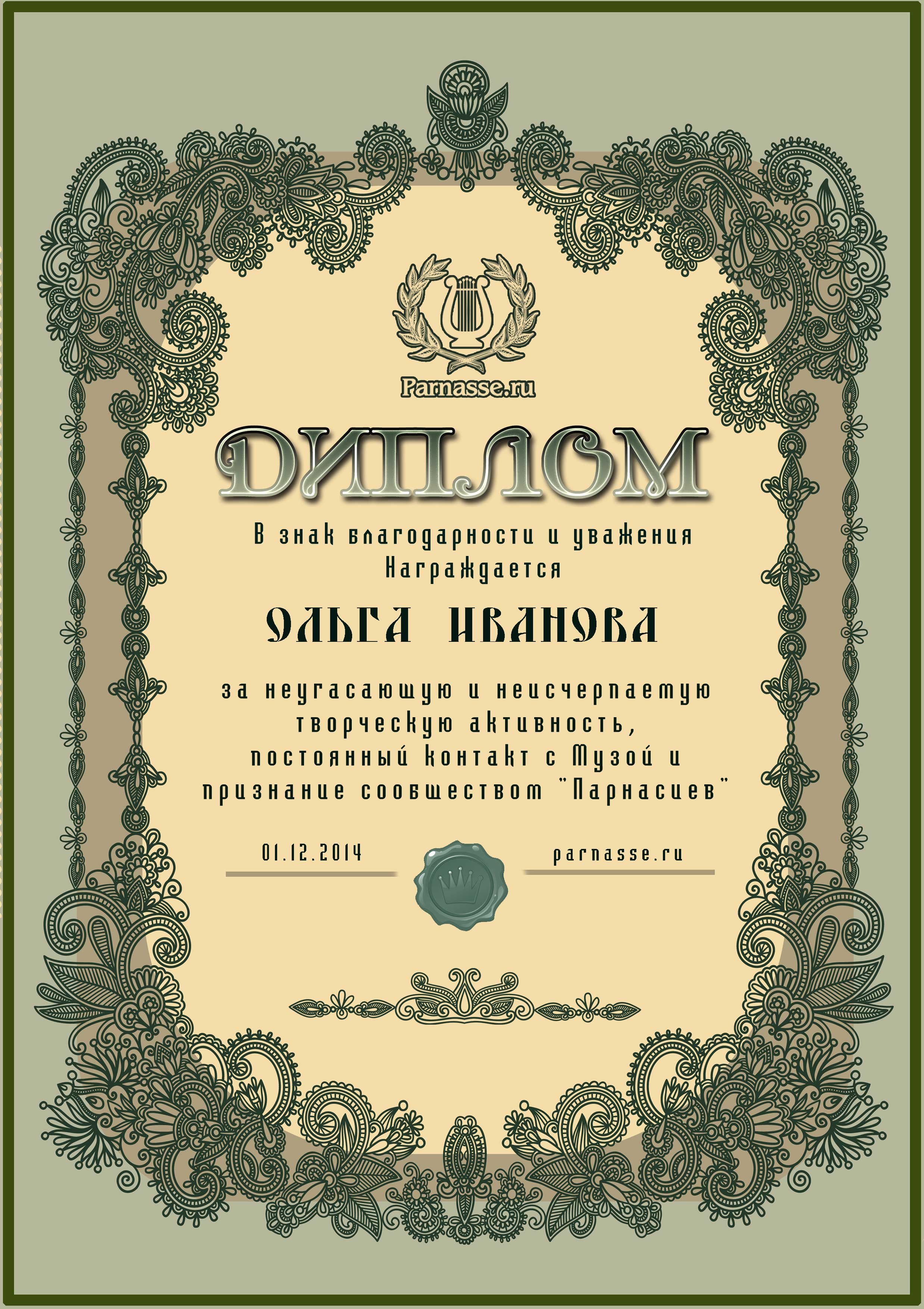 За неугасающую и неисчерпаемую творческую активность, постоянный контакт с Музой и признание сообществом "Парнасцев".От всей души желаем Вам, Ольга, здоровья, любви, успехов, благополучия, удачи и творческого вдохновения!