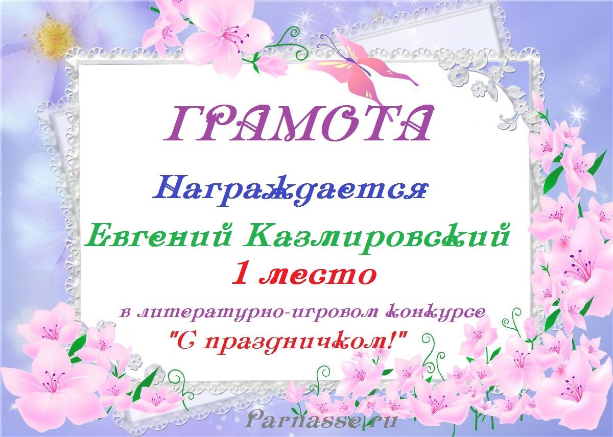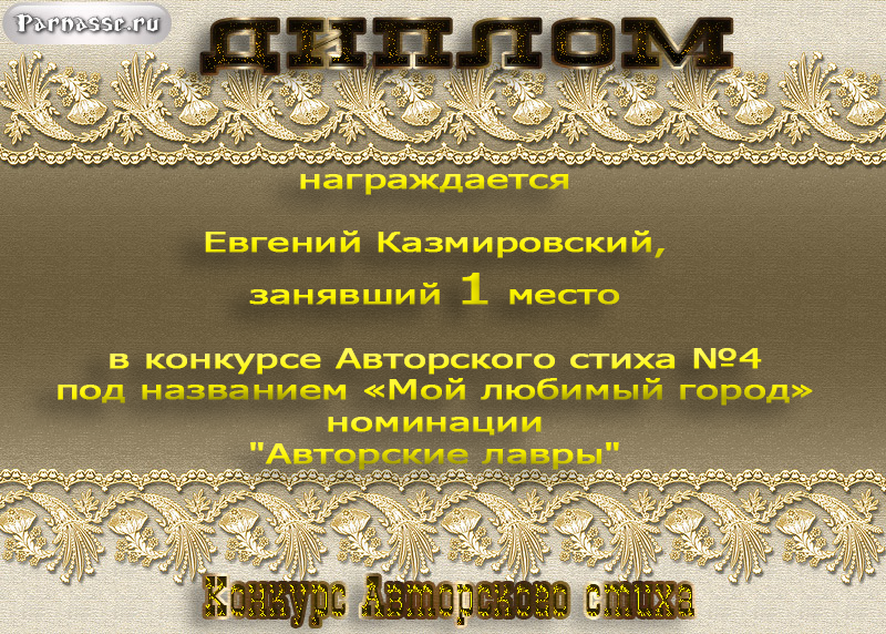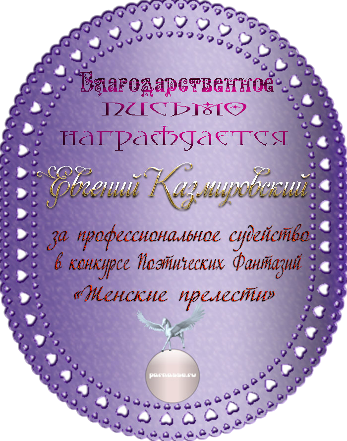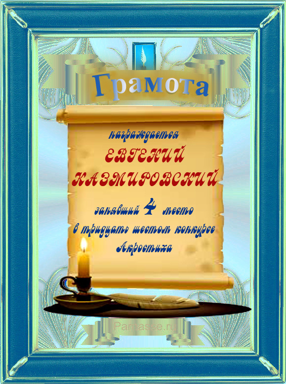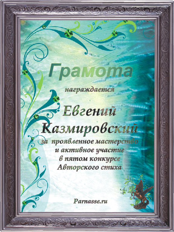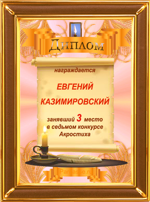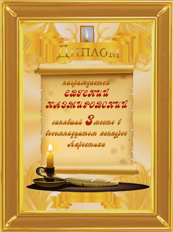 За неугасающую и неисчерпаемую творческую активность, постоянный контакт с Музой и признание сообществом "Парнасцев".От всей души желаем Вам, Евгений, здоровья, любви, успехов, благополучия, удачи и творческого вдохновения!