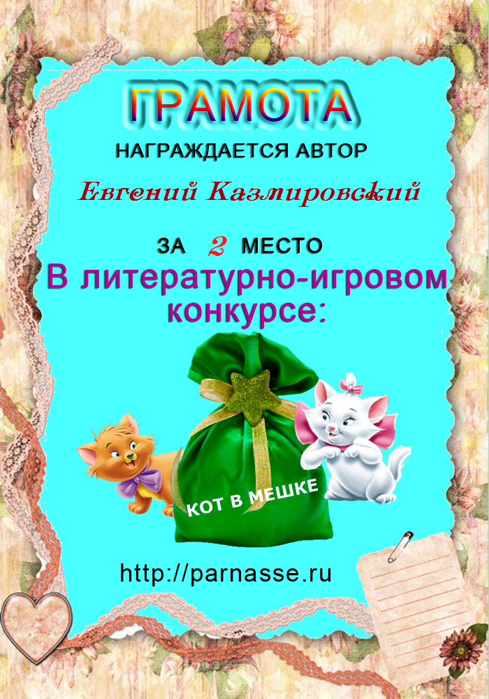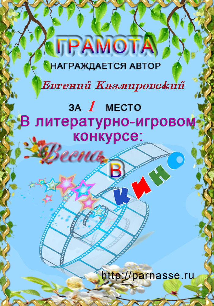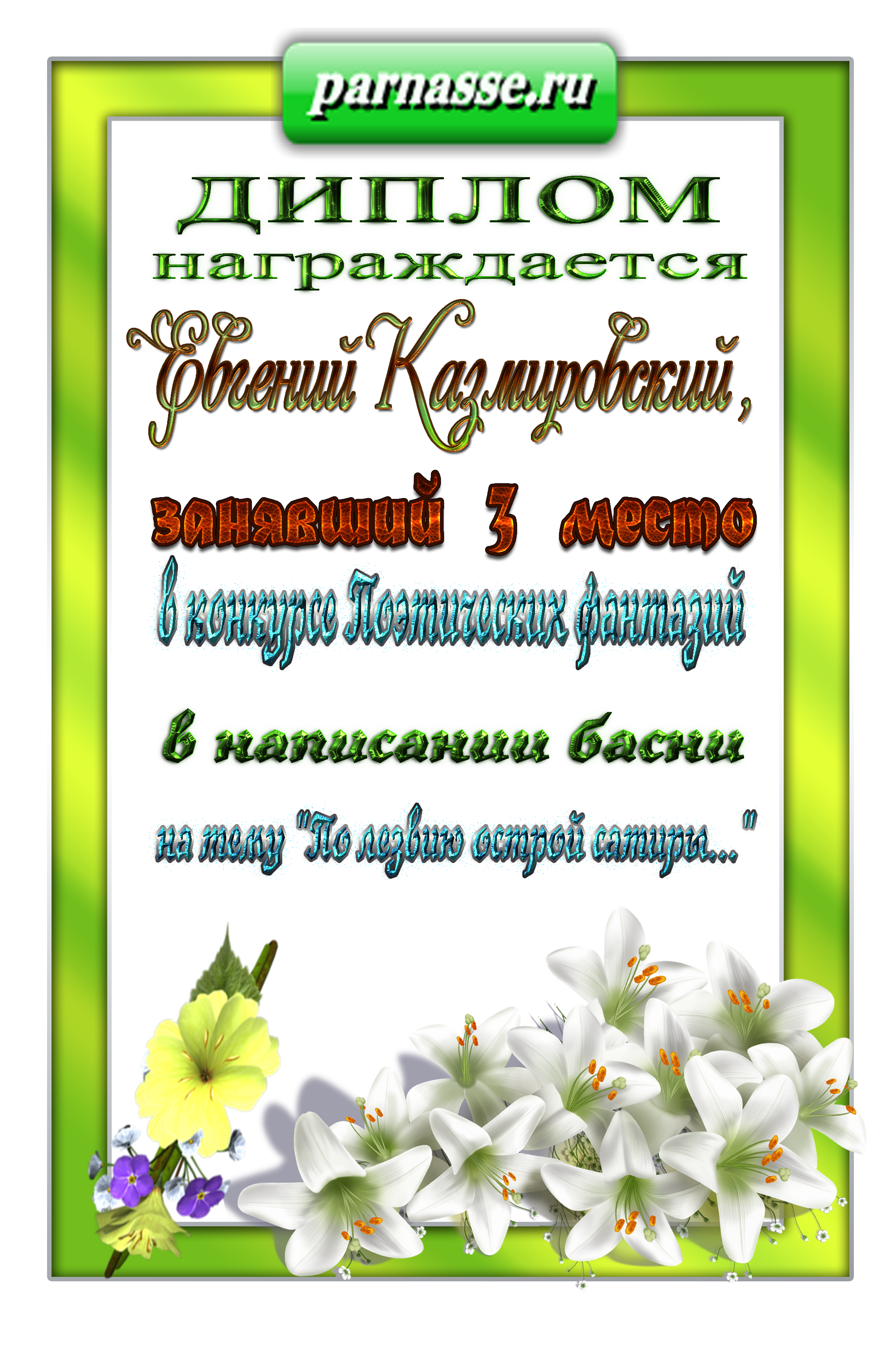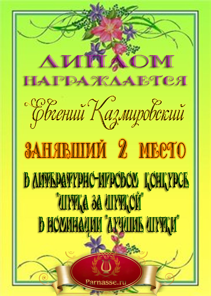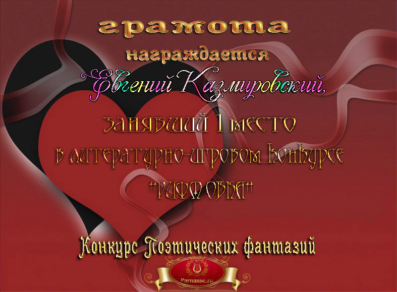 За неугасающую и неисчерпаемую творческую активность, постоянный контакт с Музой и признание сообществом "Парнасцев".От всей души желаем Вам, Евгений, здоровья, любви, успехов, благополучия, удачи и творческого вдохновения!